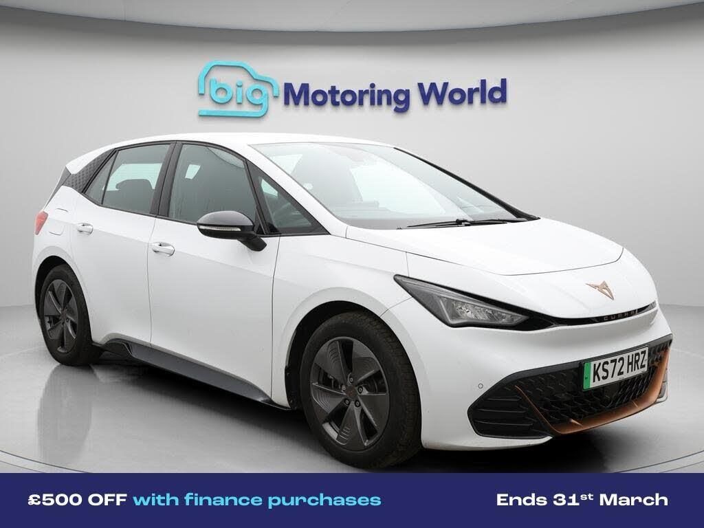 £500 towards your finance depo-Our CUPRA Born is finished in White. Specification includes a range of fantastic features including £500 towards your finance deposit, 18'' alloy wheels, Apple CarPlay, Lane Assist, Android Auto, Satellite Navigation, Rear View Camera, Heated Steering Wheel, Bluetooth, Parking Sensors Specification information is supplied by CAPHPI and may vary to the actual car. This data does not form any part of a buying contact. Please check specification prior to purchase in-store. The MOT is valid until December 2026, visit bigmotoringworld.co.uk for more photos, a 360 tour, service history and a free HPI report.Were BIG on peace of mind and this White CUPRA Born has completed our comprehensive 200 point inspection and passed all checks. Its ready for you to drive away with immediate collection in-store. We include a 90-day warranty as standard plus an option to extend for up to 3 years.Reserve this car exclusively for you, safely and securely at bigmotoringworld.co.uk, with a fully refundable £99 deposit. Test drive before you buy, with no commitment, no hassle and a completely haggle free experience. Still searching and want to see thousands more cars? We are BIG on choice with over 8000 cars to choose from.Visit our award winning web site bigmotoringworld.co.uk.Were Big Motoring World and were BIG on what matters to you.