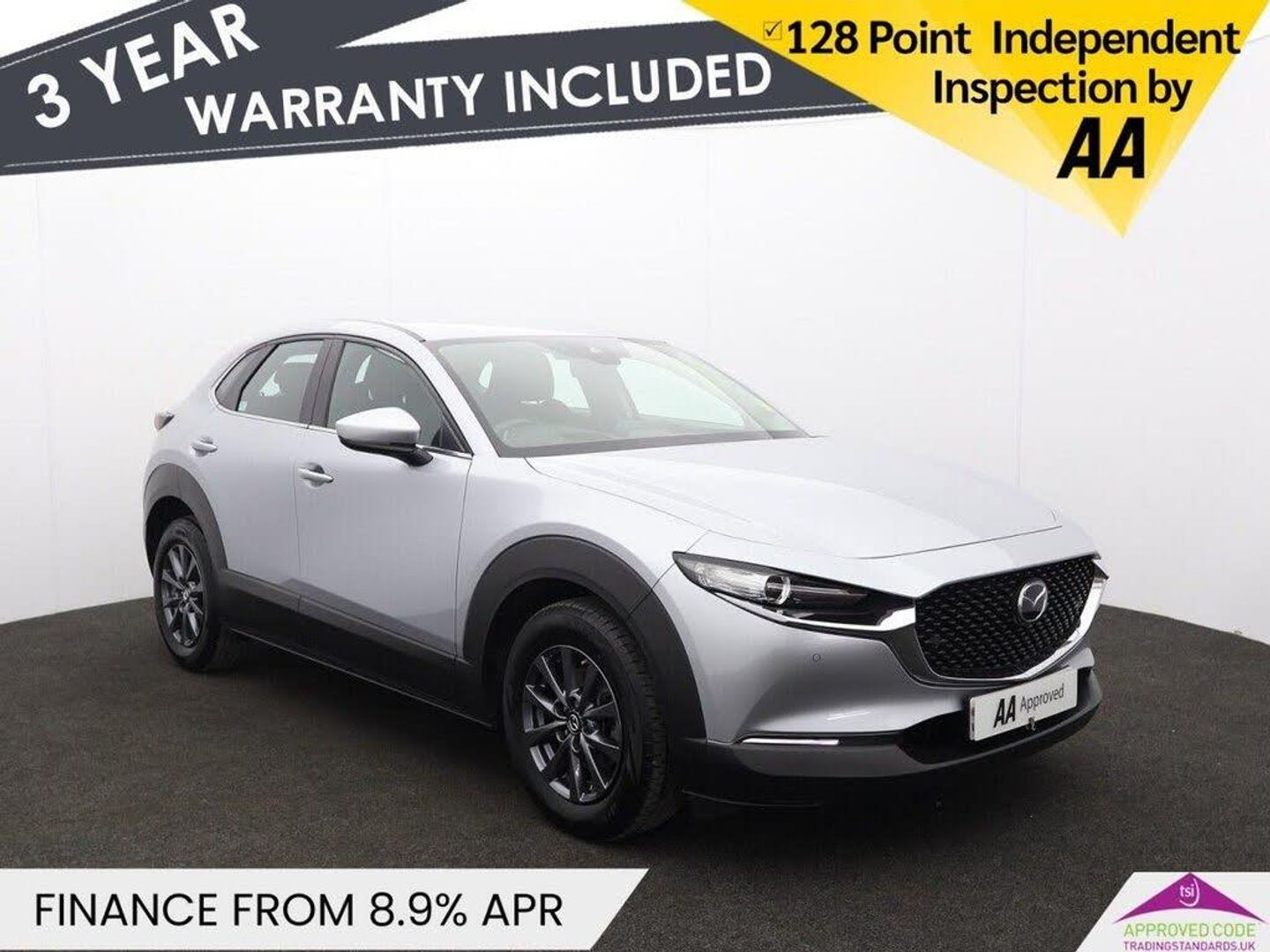 12V Electrical Power Outlet, 16in Alloy Wheels - Grey, 2 USB Charging Ports, 8.8in TFT Colour Centre Display, ABS - Anti Lock Braking System, Airbags - Curtain Front and Rear, Airbags - Front Passenger Deactivation System, AM-FM-DAB Radio with 8 Speakers, Apple CarPlay and Android Auto, Auto Dimming Drivers Door Mirror, Auto Dimming Rear View Mirror, B-Pillar and C-Pillar Garnish - Satin Black, Blind Spot Monitoring with Rear Cross Traffic Alert, Body Coloured Electrically-Adjustable - Heated - Auto Power Folding Door Mirrors, Connected Services, Door Panel Trim - Dark Cloth Insert, Door Pockets - Driver - Front Passenger and Rear, Driver and Front Passenger Airbags, Driver Attention Alert - DAA, Drivers Knee Airbags, DSC - Dynamic Stability Control, Dual Zone Climate-Controlled Air-Conditioning with Rear Air Vents, e-Call with GPS, Electric Power Assisted Steering - EPAS, Electric Windows - Front and Rear with One-Touch Auto Down - Up, Electronic Parking Brake with Auto-Disengage Function - Auto-Hold Function, Emergency Stop Signalling System - ESS, Emergency Tyre Repair Kit, Front and Rear Parking Sensors, Front Grille - Satin Black Finish, Front Side Airbags, G-Vectoring Control Plus - GVC Plus, Gear Shift - Leather-Wrapped, Glovebox Illumination, Grab Handles - Driver - Front Passenger and Two Rear with Coat Hooks, Grille - Chrome Finish Signature Wing, Headlights - Coming-Leaving Home, Headlights - Dusk-Sensing Lights, Headlights - LED with Auto Headlight Levelling, Heated Front Seats with 3-Stage Settings, High Beam Control, Hill Launch Assist - HLA, Instrument Panel 7in TFT Colour Driver Display, Integrated Bluetooth System, Integrated Mazda Navigation System with 5-Years Free European Map Updates, Intelligent Speed Assist, Interior Colouration - Black, ISOFIX Child Seat Anchorage for Outer Rear Seats, Kodo Turn Signal, Lane Keep Assist with Lane Departure Warning System, Leather-Wrapped Steering Wheel with Telescopic and Tilt Adjustment, LED Interior Lighting - Front and Rear, LED Rear Combination Lights, Luggage Compartment - Light, Mazda Radar Cruise Control, Multimedia Commander, Rain-Sensing Front Wipers with Adjustable Sensitivity and Speed, Rear Roof Spoiler - Gloss Black, Rear Seats - Folding Centre Armrest Equipped with Two Cup Holders, Rear Wiper, Remote Central Locking with Deadlocking, Reversing Camera, Roof Headlining - Light - Ceiling and Pillars, Roof Mounted Sunglasses Holder, Seat Map Pocket Located on Front Passenger Seat, Seatbelt Reminder Audible Warning, Seats - 60-40 Split Folding Rear, Seats - Drivers Manual Slide-Recline Height and Tilt Adjustment, Seats - Front Passenger Manual Slide - Recline and Height Adjustment, Smart City Brake Support - Front Only, Smart Keyless Entry, Sonic Silver, Steering Wheel Mounted Audio and Bluetooth Controls, Storage Spaces - Front Centre Console with Two Cupholders, Sun Visors - Drivers and Front Passengers with Covered Vanity Mirror and Ticket Holder, Tailpipes - Dual - Chrome Tip, TCS - Traction Control System, Thatcham Accredited Alarm and Immobiliser, Three Height Adjustable Head Restraints, Traffic Sign Recognition, Trip Computer, Tyre Pressure Monitoring System