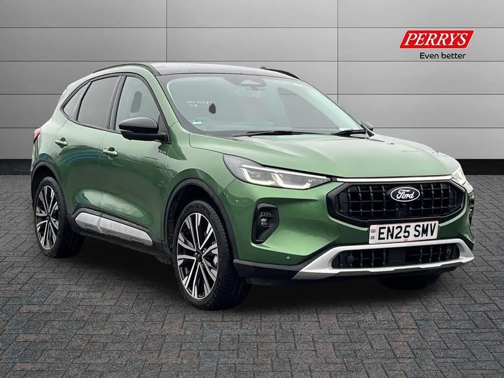 12.3" digital colour instrument cluster,360 degree view camera,Clear exit assist,Cross traffic alert with active braking,e-Call (emergency call),Ford easy fuel,Ford SYNC 4 Navigation with 13" touchscreen, DAB radio, emergency assistance, Andriod Auto/Apple CarPlay, 5G modem & Ford Pass connect,Front and rear parking sensors,Hands free power tailgate,Lane centering assist,Lane keeping aid with lane departure warning,Power assist steering,Selectable drive modes,Service interval indicator,Standard suspension,B&O premium audio system with 10 speakers, subwoofer and 2 USB ports,Active body styling kit including black mirror caps and a contrast black painted roof,Auto headlamps with high and low beam,Black roof rails,Body colour bumpers,Front LED fog lamps,LED daytime running lights,LED rear lights,LED third brake light,Pop out door edge protectors,Power front/rear windows with global close,Power heated folding door mirrors with puddle lights, memory function and camera,Quickclear heated windscreen,Rain sensing wipers,Rear privacy glass,Rear side wing doors,Rear spoiler,Rear wiper,2nd row sliding seats,Active seats,Electronic automatic temperature control (EATC),Front and rear head restraints,Partial premium touch sensico upholstery,Rear centre head restraint,Single front passenger seat,Driver assistance pack - Kuga Auto,3x3 point rear seatbelts,Airbags - front driver/passenger, front and rear curtain,Drivers knee airbag,Dynamic brake support,Electronic stability control (ESC) and ABS,Evasive steering assist,Ford MyKey Gen 2 safety system,Manual child proof rear door locks,Pre collision assist with autonomous emergency braking,Rear seat Occupancy alert,Tyre pressure monitoring system,Engine immobiliser,Keyless entry and Ford power start button (Keyless start),Locking wheel nuts,Remote powered central double locking doors,Thatcham category 1 alarm,20in Alloy Wheels - 5x2 Spoke - Absolute Black - Machined,Bursting Green,Cargo Compartment Net,Glare-Free Dynamic Matrix LED Headlamps with a Coast-to-Coast Light Bar between the Headlights,Head-Up Display,Home Socket Charge Cable - In Addition to Single Phase Charge Cable,Luggage Compartment Mat,Mini Spare Wheel,Power Opening Panoramic Roof,Winter Pack