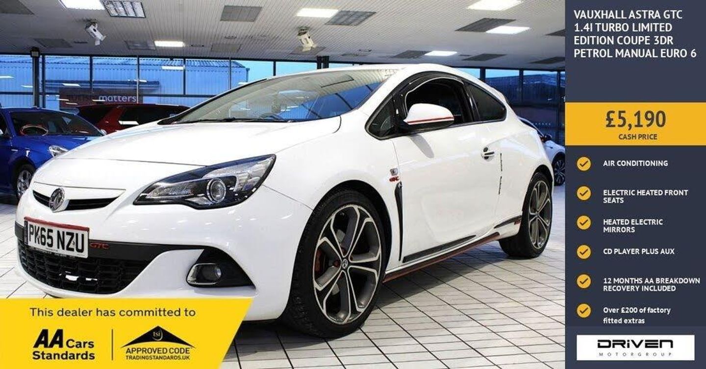 VAUXHALL ASTRA GTC 1.4I TURBO LIMITED EDITION COUPE 3DR FINISHED IN SUMMIT WHITE AND COMPLIMENTED WITH TWO TONE CHARCOAL INTERIOR, THIS VEHICLE HAS BEEN VERY WELL CARED FOR AND MAINTAINED WITH DOCUMENTED SERVICE HISTORY PLUS COMPREHENSIVE PRE DELIVERY HEALTH CHECK AND SERVICE COMPLETED PRIOR TO SALE AT 68572 MILES. KEY FEATURES INCLUDE 20 INCH ALLOY WHEELS, AIR CONDITIONING, AMBIENT LIGHTING, AUX INPUT, CD PLAYER, CRUISE CONTROL, COLOUR DISPLAY, DMB DIGITAL RADIO, ELECTRIC HEATED DOOR MIRRORS, BLUETOOTH, SATALLITE NAVIGATION, HEATED FRONT SEATS, STEERING WHEEL MOUNTED CONTROLS, VSR STYLING PACK, TINTED WINDOWS PLUS MUCH MORE. COMMITTED TO AA CARS STANDARDS: 3 MONTHS OR 3000 MILES WARRANTY INCLUDED WITH AN OPTION TO UPGRADE: 12 MONTHS AA BREAKDOWN RECOVERY INCLUDED: £75.00 CONTRIBUTION TOWARDS YOUR NEXT SERVICE/MOT AT ANY AA CARS STANDARD APPROVED WORKSHOP: WE STAND BY THE QUALITY OF OUR VEHICLES. WITH THE PURCHASE OF THIS VEHICLE, YOU WILL RECEIVE 3 MONTHS OR 3000 WARRANTY, 12 MONTHS AA BREAKDOWN RECOVERY, GIVING YOU ADDITIONAL PEACE OF MIND AND PROTECTION. ALL OUR CARS COME WITH AT LEAST 6 MONTHS MOT AND PRE SALE HEALTH CHECK AND ROAD TEST. OUR PROFESSIONAL TEAM ENSURES YOUR VEHICLE STAYS IN TOP CONDITION, AND YOU ENJOY A HASSLE-FREE OWNERSHIP EXPERIENCE. 4.7 STARS ON GOOGLE WITH OVER 550 REVIEWS: JOIN OUR COMMUNITY OF SATISFIED CUSTOMERS! OUR DEALERSHIP IS PROUD TO HAVE A 4.7 STAR RATING ON GOOGLE, BACKED BY OVER 550 POSITIVE REVIEWS. WE ARE COMMITTED TO PROVIDING EXCELLENT SERVICE AND HIGH-QUALITY VEHICLES. This Vehicle Comes Equipped with High Specification, Which Includes: - Drive this car home with complete confidence and satisfaction: All cars proudly offered by driven group are rigorously inspected, hpi checked and prepared to the highest standard To drive this car home, visit www.drivegroup.co.uk or call 01642-601999 to arrange an appointment with our sales team Please note we do not operate an organised distance selling scheme as defined by the consumer contracts (cancellation, information and additional charges) regulations 2013. Therefore, even if you choose to not view your vehicle at our premises prior to purchase,you will not be entitled to cancel your order under any 14 day cancellation period. All other statutory rights remain unaffected. Whilst every effort has been made to ensure the accuracy of the information contained in this website, please check with us about any item which may affect your decision to purchase. Driven motor group shall not be liable for any errors, inaccuracies or delays in content.