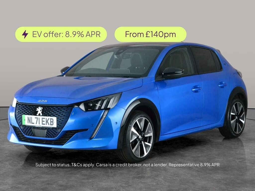 Experience the stylish blue Peugeot E-208 GT Premium, where cutting-edge tech meets comfort. Enjoy effortless access with keyless entry and start, while heated Alcantara seats and adaptive cruise control make every journey a pleasure. Navigate with confidence using Park Assist, a reversing camera, and blind spot assist. Immerse yourself in Apple CarPlay, Bluetooth audio streaming, and intuitive sat nav. LED headlights illuminate your drive, making this electric hatchback a true standout. 3 services recorded, last serviced on 31/07/2025 at 38,877 miles. MOT to 10/09/2026. Visit our website for service history, online valuation, full vehicle specification plus multiple images. This vehicle is VAT qualifying. Any feature/option specified here is from 3rd party data. We cannot guarantee the accuracy of any specification supplied by a 3rd party. We recommend that you physically check the specification of the vehicle on site prior to purchase. This information does not form part of the buying contract. Terms & Conditions apply. We have over 2,000 cars available from our 10 national branches, check our website to see all our stock. Our Trustpilot rating is 4.4/5 with over 9,000 reviews.