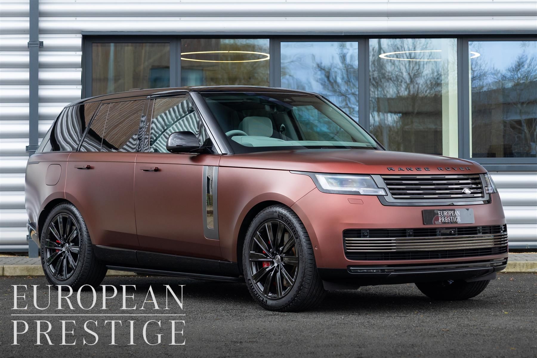 2025 Land Rover Range Rover P550e SV finished in Satin Sunrise Copper over a Light Cloud and Cinder Grey Leather interior.