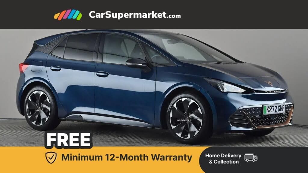 5.3" digital cockpit with 12" central display infotainment system,Augmented reality head up display,Bluetooth without wireless charger,Driving profile selection - Range, Comfort, Performance, Individual,Dynamic steering,Emergency steering support with turn assist,Forward collision warning with automatic braking,Front/rear park distance control,Lane assist,PAS,Tailgate,Voice assistant,Wireless full link smartphone integration,120kW DC charging capacity,7.4 kW onboard charger,Shock absorption in front,Sports rear shock absorption,2x USB sockets in front,2x USB sockets in rear, charge only,DAB (Digital Audio Broadcasting) and AM/FM radio,Acoustic windshield,Auto dimming rear view mirror,Dark tinted rear windows,Daytime running lights,Electric adjustable/heated/folding door mirrors,Full LED headlights,Grey exterior mirrors,Heat insulated glass,Heated washer nozzles,LED 3rd brake light,LED rear lights,Rear side wing doors,Rear wiper,Transport protection film,Variable intermittent wiper,Welcome home function and adverse weather function,Windshield wiper with light/rain sensor,3 seat bench in 2nd row,Aluminium pedals,CUPRA emblem on steering wheel,Dual zone climate control,Electric auxiliary air heater,Heated front seats,Heated leather wrapped multi function steering wheel,Integrated front head restraints,ISOFIX points in outer rear seats with top tether anchorage points,Manual height adjustable front seats,Multi-colour ambient interior lighting,Rear headrests,SEAQUAL Yarn cloth upholstery,Single front passenger seat,Sunvisors with illuminated mirror,Unsplit rear seat bench, split folding backrest, without centre armrest,3 point seatbelts on all rear seats,Driver and front passenger airbags with front passenger airbag deactivation, side airbag in front with curtain airbag and front interaction airbag,Extended safety system with proactive passenger protection system,Manual child lock in rear doors,Public e-call,Tiredness recognition system, driver alert system,Tyre pressure monitoring system,Visual and acoustic seat belt reminder,Anti theft alarm system with interior monitoring in cab, backup horn and towing protection,Anti theft wheel bolts,Keyless go central locking system,19" Typhoon alloy wheels,Tool kit,Tyre repair kit