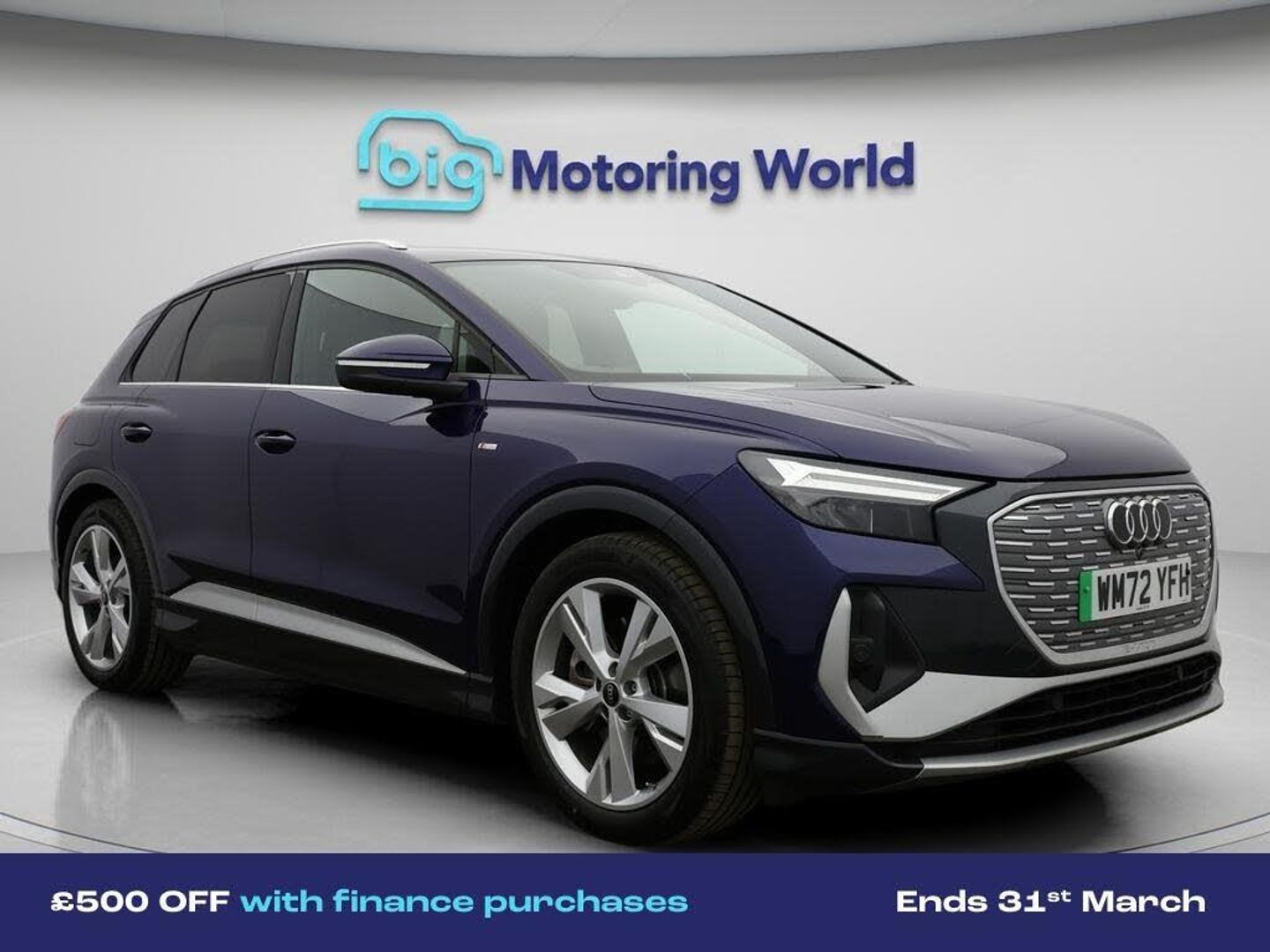 £500 towards your finance depo-Our Audi Q4 e-tron is finished in Blue. Specification includes a range of fantastic features including £500 towards your finance deposit, Part Leather Seats, Apple CarPlay, Lane Assist, S Line Body Styling, Android Auto, Satellite Navigation, Privacy Glass, Heated Seats, Rear View Camera Specification information is supplied by CAPHPI and may vary to the actual car. This data does not form any part of a buying contact. Please check specification prior to purchase in-store. The MOT is valid until February 2027, visit bigmotoringworld.co.uk for more photos, a 360 tour, service history and a free HPI report.Were BIG on peace of mind and this Blue Audi Q4 e-tron has completed our comprehensive 200 point inspection and passed all checks. Its ready for you to drive away with immediate collection in-store. We include a 90-day warranty as standard plus an option to extend for up to 3 years.Reserve this car exclusively for you, safely and securely at bigmotoringworld.co.uk, with a fully refundable £99 deposit. Test drive before you buy, with no commitment, no hassle and a completely haggle free experience. Still searching and want to see thousands more cars? We are BIG on choice with over 8000 cars to choose from.Visit our award winning web site bigmotoringworld.co.uk.Were Big Motoring World and were BIG on what matters to you.