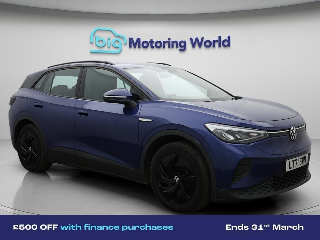 £500 towards your finance depo-Our Volkswagen ID.4 comes with optional extras worth £635. Specification includes a range of fantastic features including £500 towards your finance deposit, Part Leather Seats, Apple CarPlay, Lane Assist, Android Auto, Satellite Navigation, Heated Seats, Heated Steering Wheel, Bluetooth, Parking Sensors Specification information is supplied by CAPHPI and may vary to the actual car. This data does not form any part of a buying contact. Please check specification prior to purchase in-store. The MOT is valid until February 2027, visit bigmotoringworld.co.uk for more photos, a 360 tour, service history and a free HPI report.Were BIG on peace of mind and this Blue Volkswagen ID.4 has completed our comprehensive 200 point inspection and passed all checks. Its ready for you to drive away with immediate collection in-store. We include a 90-day warranty as standard plus an option to extend for up to 3 years.Reserve this car exclusively for you, safely and securely at bigmotoringworld.co.uk, with a fully refundable £99 deposit. Test drive before you buy, with no commitment, no hassle and a completely haggle free experience. Still searching and want to see thousands more cars? We are BIG on choice with over 8000 cars to choose from.Visit our award winning web site bigmotoringworld.co.uk.Were Big Motoring World and were BIG on what matters to you.