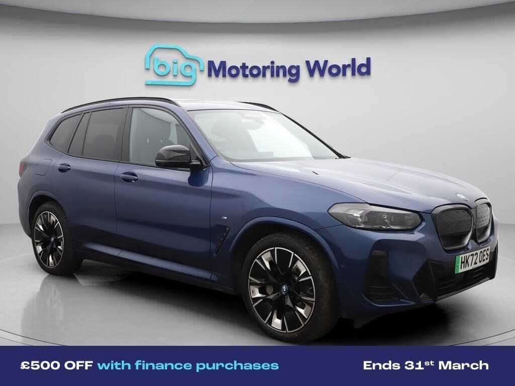 £500 towards your finance depo-Our BMW iX3 is finished in Blue. Specification includes a range of fantastic features including £500 towards your finance deposit, Panoramic Roof, Sun Protection Pack, Head up Display, 20'' Alloy Wheels, Leather Seats, Apple CarPlay, Adaptive Cruise Control, Electric Seats, Harman Kardon Speakers Specification information is supplied by CAPHPI and may vary to the actual car. This data does not form any part of a buying contact. Please check specification prior to purchase in-store. The MOT is valid until January 2027, visit bigmotoringworld.co.uk for more photos, a 360 tour, service history and a free HPI report.Were BIG on peace of mind and this Blue BMW iX3 has completed our comprehensive 200 point inspection and passed all checks. Its ready for you to drive away with immediate collection in-store. We include a 90-day warranty as standard plus an option to extend for up to 3 years.Reserve this car exclusively for you, safely and securely at bigmotoringworld.co.uk, with a fully refundable £99 deposit. Test drive before you buy, with no commitment, no hassle and a completely haggle free experience. Still searching and want to see thousands more cars? We are BIG on choice with over 8000 cars to choose from.Visit our award winning web site bigmotoringworld.co.uk.Were Big Motoring World and were BIG on what matters to you.