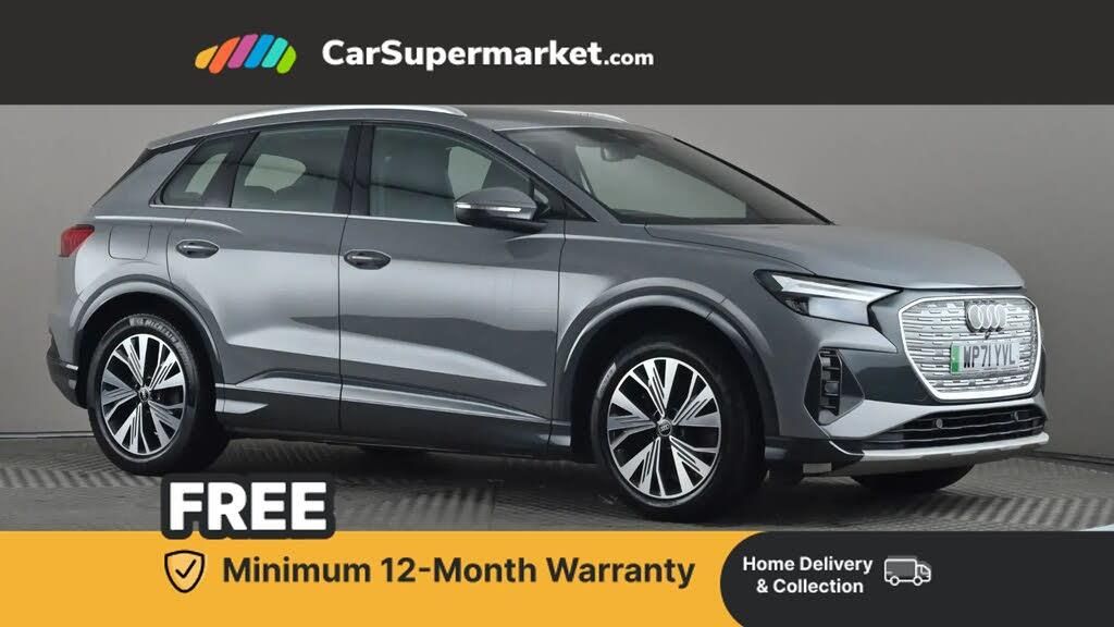 Audi connect safety and service (e-call),Audi drive select,Audi Smartphone Interface with wireless functionality,Bluetooth interface,Camera based traffic sign recognition,Lane departure warning system,MMI Navigation Plus with high resolution 10.1 inch touchscreen colour display,Power operated tailgate,Progressive steering,Swerve assist and turn assist,11KW onboard charger,125kW DC charging capability,AC and DC charging access point positioned on the rear right,Compact e-tron charging system,Household plug type G (GB),Industry plug CEE 32 A/230 V/6 h/long + straight,Mode 3 AC charging cable 22 kW,DAB Digital radio,Acoustic glass windscreen,Aluminium roof rails,Body coloured door mirrors,Contrast bumpers in Manhattan grey,Electrically adjustable/heated/folding/auto dimming door mirrors with integrated LED indications + kerb view function for passenger side,Frameless auto dimming interior rear view mirror,LED daytime running lights,Projection light in the exterior mirrors, e-tron logo projected from the underside of the exterior mirror onto the ground,Single frame grille with a structured, closed surface within an octagonal shape,3 zone automatic air conditioning,4 way electric lumbar support for driver and front passenger,40:60 Split folding rear seat or folded fully,Accent surfaces in gloss black - centre console control panel, switch panel and trim on front doors in gloss black,Auxiliary air conditioning,Comfort front centre armrest,Door sill trims with aluminium inlay,Driver/passenger manual seat height adjustment,Front and rear head restraints,Heated front seats,Steel grey cloth headlining,Gloss styling pack - Q4 E-tron,Non smoking pack - Q4 E-tron,White interior light pack - Q4 E-tron,3x3 point rear seatbelts,Active vehicle alerting system (AVAS),Driver and front passenger airbag with passenger airbag deactivation,Electric child locks,Front side airbags with head airbags and interaction airbag,Pre-sense front with pedestrian and cyclist detection,Seatbelt warning,Tyre pressure loss indicator,Warning triangle and first aid kit,Anti theft alarm,Anti-theft wheel bolts,Keyless Go,Aluminium look interior elements,Inlay in black paint finish, accent surfaces on the instrument panel and centre console in silver paint effect finish,19" 5 W spoke aero alloy wheels with graphite grey gloss finish,Tool kit,Tyre repair kit,Comfort and sound pack - Q4 E-tron,Technology pack without Audi phone box - Q4 E-tron