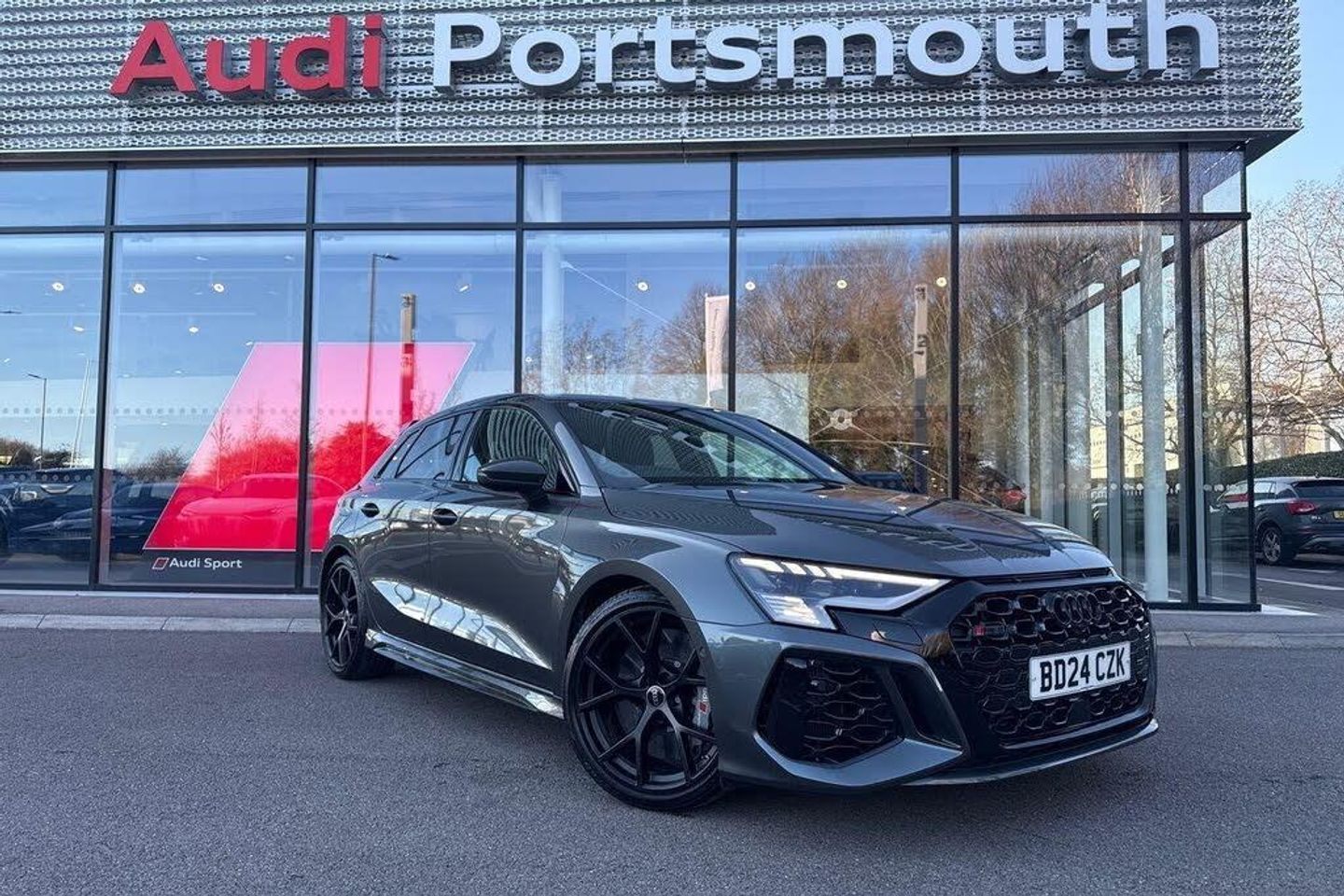 COMFORT & SOUND PACK ( REAR VIEW CAMERA, BANG & OLUFSEN PREMIUM SOUND SYSTEM WITH 3D SOUND) RS DYNAMIC SUSPENSION, TOP SPEED INCREASED TO 180 MPH, RS CERAMIC BRAKES, RS DYNAMIC PACK, TECHNOLOGY PACK PRO ( RS SPORTS EXHAUST SYSTEM, RS EXTERIOR FEATURES IN GLOSS BLACK, CARBON ROOF SPOLIER, ENGINE COVER WITH CARBON ELEMENTS, BLACK APPEARANCE PACK PLUS, SIDE SKIRT IN CARBON ) ADVANCED KEY, COMFORT KEY WITH SAFELOCK, SATELLITE NAVIGATION, MULTI FUNCTION STEERING WHEEL, HILL HOLD ASSIST, CRUISE CONTROL, AUDI VIRTUAL COCKPIT, LANE DEPARTURE WARNING, APPLE CARPLAY, ANDROID AUTO, DAB RADIO, TINTED WINDOWS - PRIVACY GLASS, FRONT AND REAR PARKING SENSORS, SPLIT FOLDING REAR SEATS, LIGHT & RAIN SENSOR, AUTO DIMMING REAR VIEW MIRROR, SELECTABLE DRIVING MODES, PUSH BUTTON START, DAYTONA GREY WITH LEATHER UPHOLSTERY, 19'' 5 SPOKE Y STYLE ALLOY WHEELS, DUAL ZONE CLIMATE CONTROL, HEATED FRONT SEATS, DARKENED MATRIX LED HEADLIGHTS WITH DYNAMIC REAR INDICATORS, VOICE ACTIVATED CONTROLS AND MUCH MORE.This car comes with the balance of the manufacturers warranty until 18/4/2027.Portsmouth Audi are delighted to offer this Audi RS3 in Daytona grey over Leather and has completed just 13005 miles., We are proud to be part of the Harwoods group, a family run business established in 1931. With four Approved Audi retailers within our group, we have access to over 400 vehicles. If this isn't the right car for you, please contact us and we will find it. Our group stock has spec to include Sunroof, Leather, Heated Seats, Apple Car Play, Heated Steering Wheel, Reverse Camera, Rear Entertainment, Towbar, 360-degree camera, Comfort & Sound Pack, Tech Pack, Panoramic Sun Roof, Tow Bar, Black Pack, Air Suspension, Apple Carplay, Adaptive Cruise, Massage Seats, Refrigerator, AWD, Technology Pack, Head up Display.-COMFORT & SOUND PACKAGE-Video Presentation available on Request