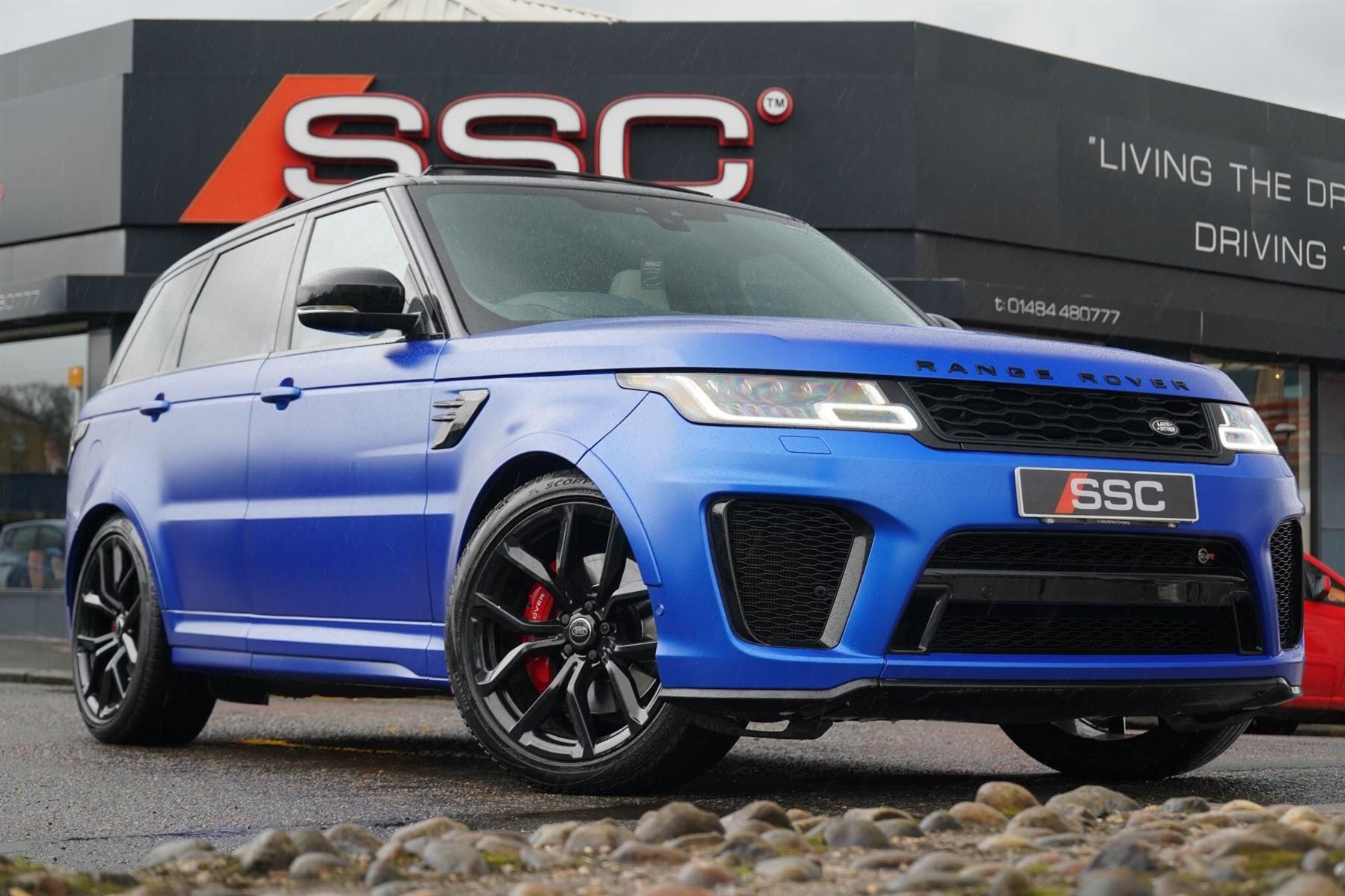 Stunning SVR Finished In SVO Palette Satin Velocity Blue With Ebony and Cirrus Two Tone Windsor Leather Interior. Fantastic Spec Inc: Electric Towbar, Head Up Display, Ebony Suedecloth Headliner, Front Centre Console Refrigerator, Panoramic Sliding Sunroof, 22'' Alloys In Black, Red Calipers, Electric Heated Front SVR Sports Seats With Memory, Heated Rear Seats, Meridian Surround Sound, Privacy Glass, Adaptive Dynamics, Dynamic Response, Tyre Pressure Monitoring System, Heated Steering Wheel, Navigation Pro, Touch Pro Duo, Keyless Entry, Electric Folding Mirrors With Memory, Emergency Braking, Lane Departure Warning, Rear View Camera, Adaptive Cruise Control, 360 Parking Aid, Clear Exit Monitor, Rear Traffic Monitor, Driver Condition Monitor, Traffic Sign Recognition and Adaptive Speed Limiter, Blind Spot Monitor, High-Speed Emergency Braking, Configurable Ambient Lighting, Extended Leather Upgrade. This SVR Comes With Full Land Rover Service History and Extended Warranty Until November 2026