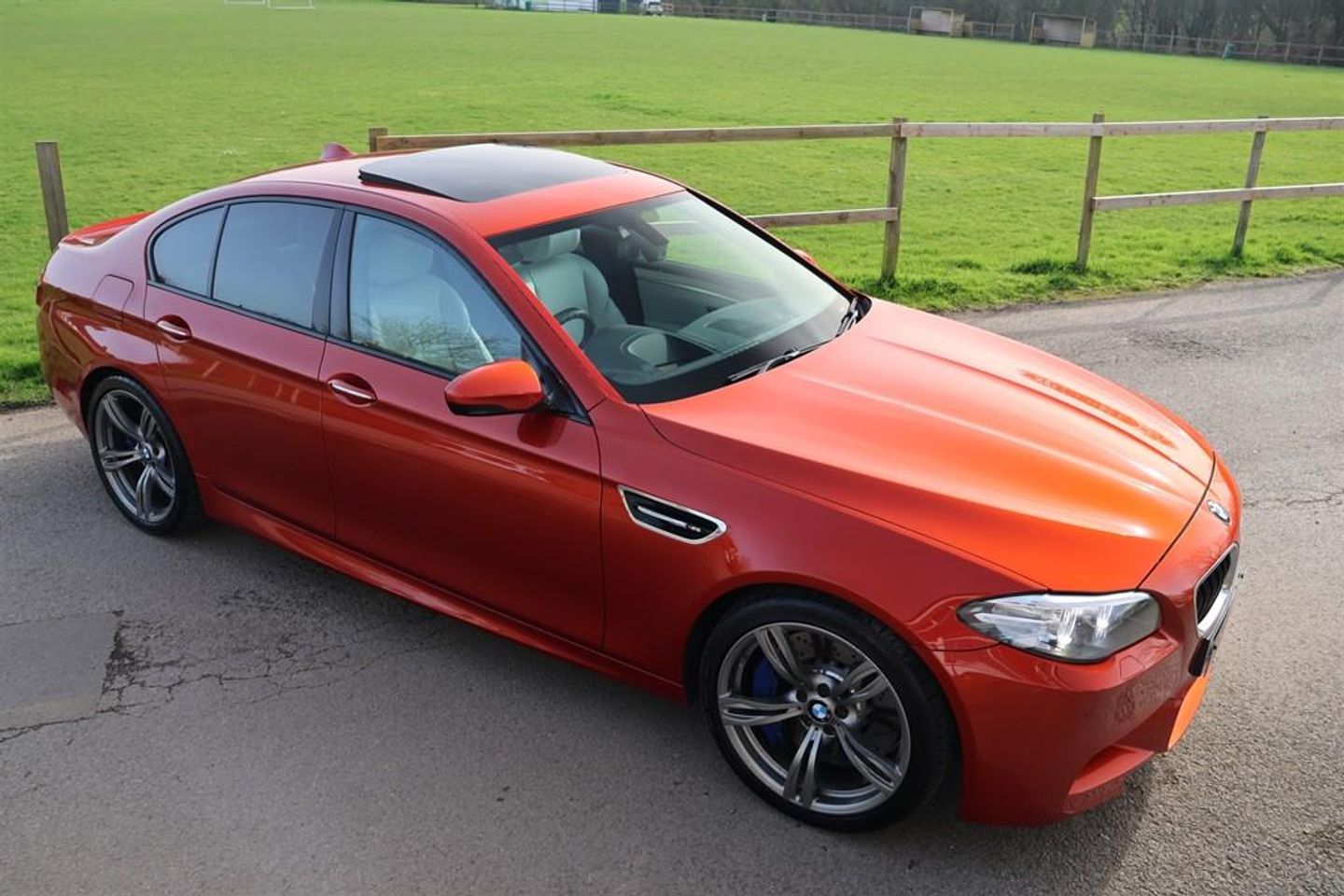 Stunning low mileage high specification 2015 Model BMW M5 V8 DCT finished in Sakhir Orange with Extended Merino Silverstone Leather M Seats.. Covered just 46,000 miles with a Full BMW history. Auto start/stop function Brake Energy Regeneration Adaptive suspension Steering wheel column adjustment electric M twin-clutch transmission with Drive logic Locking wheel bolt M double spoke 343 alloys Tyre pressure display Alarm system Reversing camera Electric Glass sunroof Floor mats velour Warning triangle and first aid kit Interior/outside mirror with auto dip Interior mirror with automatic-dip Seat adjustment, electric, with memory Sports seats Seat heating driver/passenger Interior trim strips, Alu Trace Automatic climate control with 4-zone ctrl Ambient interior light Headlight cleaning system Park Distance Control (PDC) Xenon Light Adaptive Headlights High-beam assistant Navigation system Professional Head-up display DAB tuner Harman/Kardon surround sound system Area-Code 2 for DVD Intelligent emergency call Teleservices Connected Drive Services Real-Time Traffic Information Concierge Services Remote Services Comfort telephony w/ enhanced Smartphone M Rear spoiler High gloss shadow line Individual sunshade glazing Headlining anthracite Connected Drive Services Coding, alarm signal Automatic locking during starting Active pedestrian protection Thief proofing device ULEZ COMPLIANT James Paul Car Sales is a family run business in a small village of Bucks Green conveniently situated on the Surrey and Sussex border. Established for over 35 years every car we offer is carefully hand selected and will come with a comprehensive provenance check. All of our vehicles are subject to a thorough pre delivery inspection through our workshops including a fresh MOT and service where required. Please ask us about our extremely competitive finance packages or Visit our website www.jamespaul.co.uk to create your own Finance Quote and Apply to help you fund your new car. Part exchanges welcome either way if you are looking to trade up or down. Please note that we do not accept reservations on cars via third party sites, if you wish to put a deposit on a car, please call 01403 823723 and speak to a member of the James Paul Car Sales team. 12V Power Socket - Front,12V Power Socket - Rear of Centre Console,19in Alloy Wheels - Light M Double Spoke - 345M,20GB Memory,ABS - Anti Lock Braking System,ASC - Automatic Stability Control,Active M Differential,Adaptive Headlights,Adaptive Suspension,Air Conditioning - Automatic with Four Zone Control,Airbags - Curtain Head Protection system,Airbags - Driver,Airbags - Front Side,Airbags - Passenger,Airbags - Passenger Deactivation,Alarm - Thatcham Cat 1 and Immobiliser,Alarm System Thatcham 1 with Remote Control,Ambient Lighting - Switchable BMW Classic Orange - Cold White - LED,Armrest - Front with Storage Compartment,Armrest - Rear Centre,Automatic Transmission with Gearshift Paddles,Automatically Dimming Rear View Mirror,Auxiliary Input,BMW Apps Interface,BMW ConnectedDrive Online Services,BMW Emergency Call,BMW Professional Radio - Single CD and MP3,BMW Remote Services,BMW TeleServices,Brake Callipers - Painted Blue with M Logo,Brake Drying,Brake Fade Compensation,Brake Pad Wear Indicator,Brake Pre-Tensioning,Bumpers - Body Colour,CBC - Cornering Brake Control,Central Locking - Remote,Child Proof Locking System - Rear Doors,Control Display - 10.2in Colour Display,Crash Sensor,Cruise Control with Brake Function,Cup Holders - Front and Rear,DAB - Digital Radio,DBC - Dynamic Brake Control,DSC - Dynamic Stability Control Plus,Door Handles - Body Colour,Door Mirrors - Body Coloured Housing,Door Sill Finishers - M Designation,Dynamic Brake Lights,Dynamic Safety,EBD - Electronic Brake-Force Distribution,Electric Windows - Front and Rear with Fingertip Control and Anti Pinch,Electro Mechanical Parking Brake,Enhanced Bluetooth Telephone Preparation with USB Audio Interface and Voice Control,Exhaust Tailpipes - Quad - Chrome,Exterior Mirrors - Automatically Dimming - Folding,Exterior Trim - High-Gloss Shadowline,First Aid Kit,Floor Mats - Velour,Footwell Lights - Front,Full Black Panel Display,Glass Sunroof,Head-Up Display,Headlight Wash,Headlights - Auto On,Headlining - M Anthracite,High-Beam Assistant,Hill Start Assistant,ISOFIX - Rear,Information Plus,Interior Trim - Aluminium Trace,Internet,Kidney Grille - Chrome with Double Black Vertical Slats,M Double Clutch Transmission with Drivelogic,M Drive Manager,M Mobility Tyre Sealing System,M Rear Spoiler,M Servotronic Power Steering,MDM - M Dynamic Mode,Navigation System - BMW Professional Multimedia,OBC - On Board Computer,OBD - On Board Diagnosis,PDC - Park Distance Control - Front,PDC - Park Distance Control - Front and Rear,PDC - Park Distance Control - Rear,Passenger Seat Occupancy Sensor - Front,Personal Profile,Rain Sensor with Automatic Headlight Activation,Real Time Traffic Information,Seats - Front Electric Adjustment with Driver Memory,Seats - Front Heated,Seats - Front Sports,Securing Rings in Luggage Compartment x4,Shark Fin Aerial,Smokers Package,Speaker System - BMW Advanced,Steering Column with Electric Adjustment,Steering Wheel - Leather - M Sport,Steering Wheel - Multifunction Controls,Sun Visors with Illuminated Vanity Mirrors,TPMS - Tyre Pressure Monitoring System,Toolkit,VDC - Variable Damper Control,Wheels - Locking Wheel Nuts,Windows - Heated Protection Glazing with Green Tint,Windscreen Washer Jets - Heated,Xenon Headlights,iDrive Controller with Shortcut Buttons,20in Alloy Wheels - Light Alloy M Double Spoke Style - 343M Black,Concierge Service,Extended Merino Leather - Silverstone,Reversing Assist Camera,Sakhir Orange,Speaker System - Harman Kardon,Sun Protection Glazing,12V Power Sockets