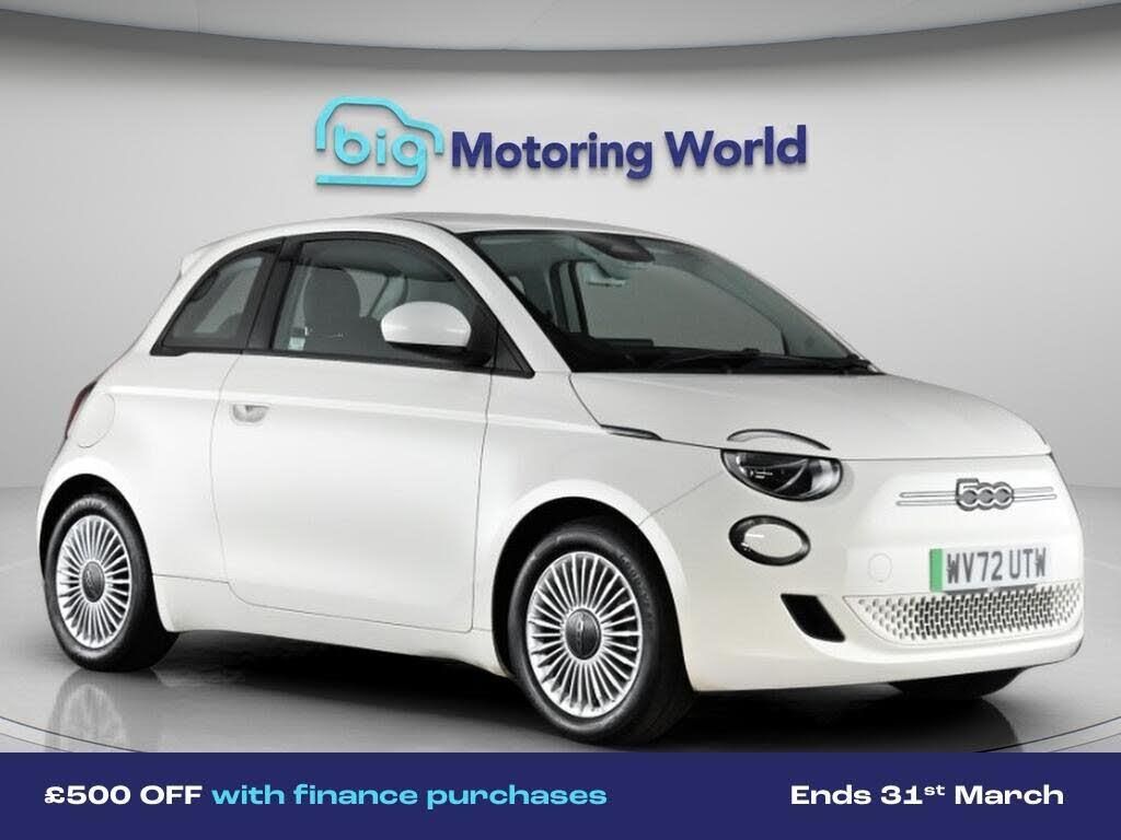 £500 towards your finance depo-Our Fiat 500e comes with optional extras worth £150. Specification includes a range of fantastic features including £500 towards your finance deposit, Satellite Navigation, Internet, Bluetooth, Parking Sensors, Cruise Control, Climate Control, Keyless Go, Voice Control, DAB Radio Specification information is supplied by CAPHPI and may vary to the actual car. This data does not form any part of a buying contact. Please check specification prior to purchase in-store. The MOT is valid until January 2027, visit bigmotoringworld.co.uk for more photos, a 360 tour, service history and a free HPI report.Were BIG on peace of mind and this White Fiat 500e has completed our comprehensive 200 point inspection and passed all checks. Its ready for you to drive away with immediate collection in-store. We include a 90-day warranty as standard plus an option to extend for up to 3 years.Reserve this car exclusively for you, safely and securely at bigmotoringworld.co.uk, with a fully refundable £99 deposit. Test drive before you buy, with no commitment, no hassle and a completely haggle free experience. Still searching and want to see thousands more cars? We are BIG on choice with over 8000 cars to choose from.Visit our award winning web site bigmotoringworld.co.uk.Were Big Motoring World and were BIG on what matters to you.