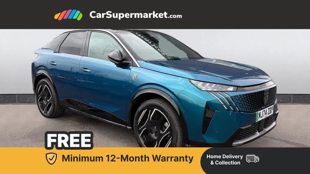 Adaptive cruise control with Stop and Go,Bluetooth with two microphones (Connect up to 2 phones),Drive modes select (Eco, normal and sport) with configurable ambient lighting,Driver foot rest,Driver profile selection,E-call,Exterior temperature indicator with ice warning,Front parking sensor,Front passenger seat detection,Hands free Smart Electric Tailgate (foot operated),Lane keep assist,Multi function trip computer,Natural voice recognition,PEUGEOT i-Cockpit - 21" HD panoramic curved display incorporating instrument panel and touchscreen with 3colour themes,PEUGEOT i-connect advanced HD fully customisable touch screen, Navigation with Tom Tom Live updates and over the air map updates,PEUGEOT SOS and assistance,Rear parking sensor,Remote charge management via My PEUGEOT App,Speed limit and traffic sign recognition and recommendation,Wireless mirror screen with apple carplay and android auto,Wireless smartphone charger with status light and ambient lighting,11 KW triphase On board charger,Dynamic stability control and electronic anti-skid system,Mode 3 type 2 cable for wallbox charging,Multi-link rear suspension,AM/FM bi-tuner,DAB Radio (Digital Audio Broadcasting),Peugeot customisable virtual iToggles,USB-C sockets (2 x front and 2 x rear),3008 model designation badgers front and rear in basalt grey,Acoustic windscreen,Automatic hazard light activation upon heavy brake application,Automatic headlamp activation,Automatic windscreen wiper activation with interval wiping intensity control,Black diamond roof and floating effect rear spoiler finished in nera black metallic,Body coloured exterior door handles,Dark tinted privacy glass for rear door, Tailgate and Quarter windows,Door mirrors - Welcome lighting and integrated LED indicators,Electric adjustable/heated/folding door mirrors,Flat blade wipers with magic wash integrated nozzles,Frameless electrochrome rear view mirror,Front and rear electric windows with one touch,Front grille with body coloured accents,Gloss black connecting strip between rear lights,Gloss black finish B pillar,Heated rear window,Laminated windscreen,LED daytime running lights,LED exterior lighting,LED third brake light,Lower front and rear bumper trims in meteor grey,Orbital gloss black door mirrors,Orbital gloss black lower door claddings and widened wheel arches,PEUGEOT shield on front wings,Pixel LED Technology headlights with adaptive high beam assist,Rain sensor,Rear full LED 3D peugeot signature claw effect lights with daylight function,Rear side wing doors,2 cupholders in front centre console,2 rear cupholders,3 seat rear bench,3x 12V sockets (Cabin front and rear and boot),4 Grab handles retractable and damped,4 tie down luggage rings,40/20/40 folding rear seat backrest with fixed base,Aluminium pedals,Arch design central console with concealed storage,Cabin high efficiency filter,Cabin thermal pre-conditioning (activated in vehicle or via remote services),Central front armrest with ventilated storage compartment and LED lighting,Chrome finish interior door handles,Compact heated multifunction steering wheel with full grain leather Iced Clay stitching, gloss black and satin chrome detailing and GT badge,Dual zone climate control,Dynamic front seats,e-Toggle compact gear selector,Electric power steering with reach and rake adjustable steering column,Glasses storage box, roof mounted,LED boot light,LED footwell lights,LED front and rear roof lights,LED Glovebox light,LED illuminated driver and passenger concealed sunvisor mirrors,Luggage cover,Mistral black pillars and headlining,Quick launch cabin heating/cooling function,Rear air vents,Rear smartphone holder,Roof lining - Meteor grey,Seatbelt unfastened on the move audible and visual alert for front and rear seats,Single front passenger seat,Stainless steel PEUGEOT door sill trims,Two bag hooks,Two position boot floor,2x Isofix child seat fitting on outer rear seats with zipped cover,3x3 point rear seat belts,ABS (Anti-lock Braking System) with EBD (Electronic Brakeforce Distribution) and EBA (Emergency Braking Assistance),Adaptive driver and front passenger airbags with passenger airbag deactivation function,Advanced Emergency Braking System with radar (AEBS3) providing night detection of pedestrians and cyclists,Child locking functionality on rear doors,Driver and front passenger side airbags,Electric parking brake,Enhanced 3 stage regenerative braking via steering wheel mounted paddles,Front and rear curtain airbags,Front optimised safety headrests and 3 x rear retractable headrests with height adjustable,Front/rear disc brakes,Hill start assist,Post collision safety brake,Seatbelts - Front and rear outer seats with pyrotechnic pretensioners and force limiters,Tyre under inflation monitoring and detection (Indirect),Acoustic vehicle alert system (AVAS),Automatic door locking when moving off,Deadlocking system,Electronic code immobiliser,Exterior passenger door lock,Locking wheel nuts
