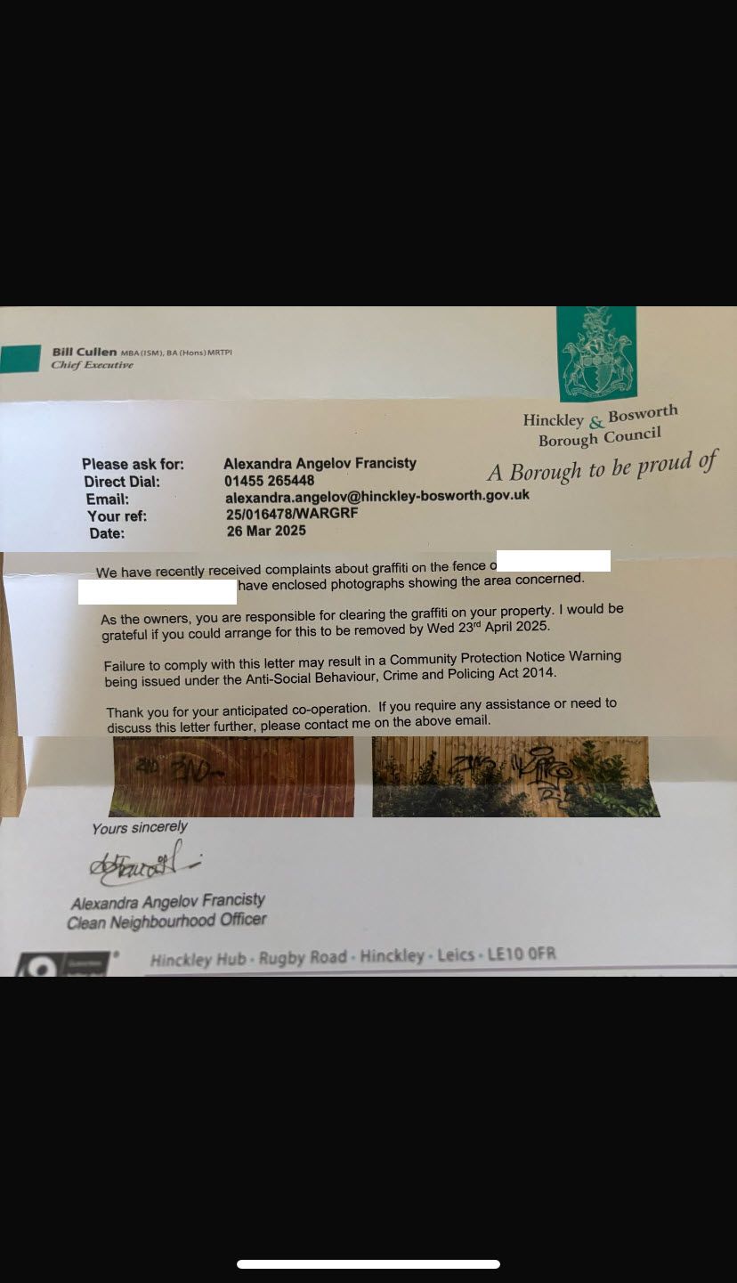 Wanted to gather some thoughts, I have received a letter which I have attached (edited to hide address etc), explaining that I will be give a community protection notice warning if I don't clean some graffiti off of my fence.