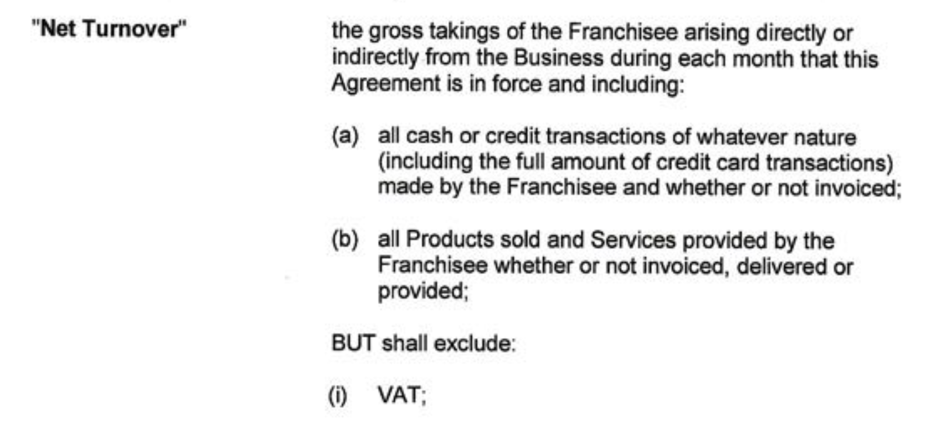 When reading the agreement in its entirety, I understood "Net Turnover" to be different to "Gross Turnover. I expected the franchisor to take 15% of the profit, rather than 15% of the turnover. IANAL, unlike ATG although in the extract you have put, I read nett as all turnover less VAT. I.e. all sales net of VAT.