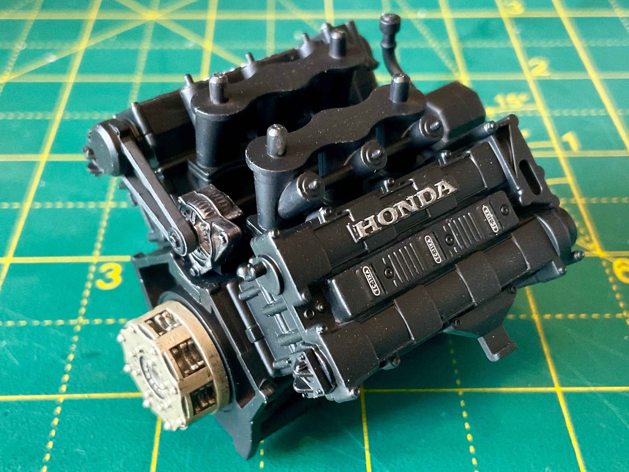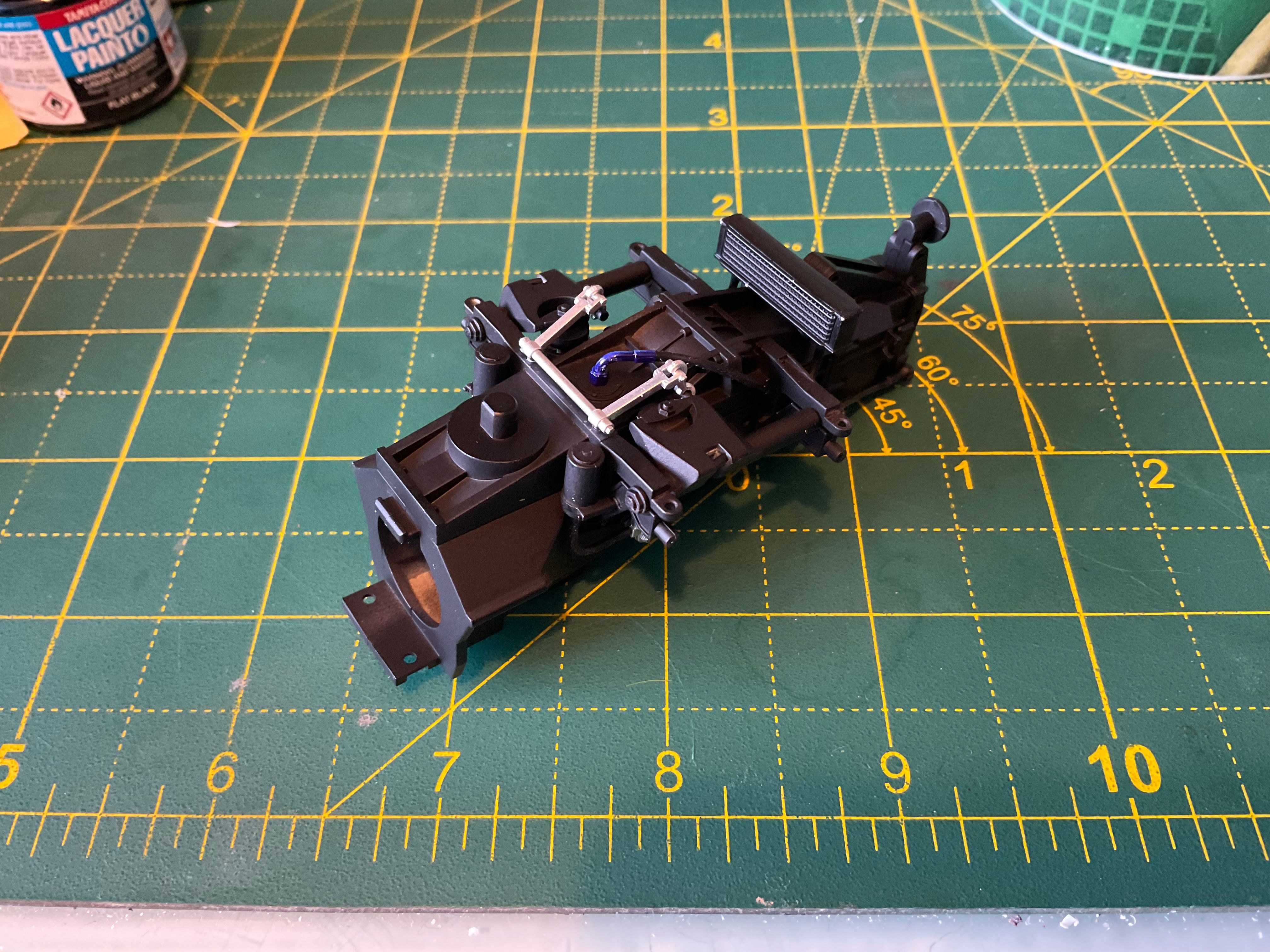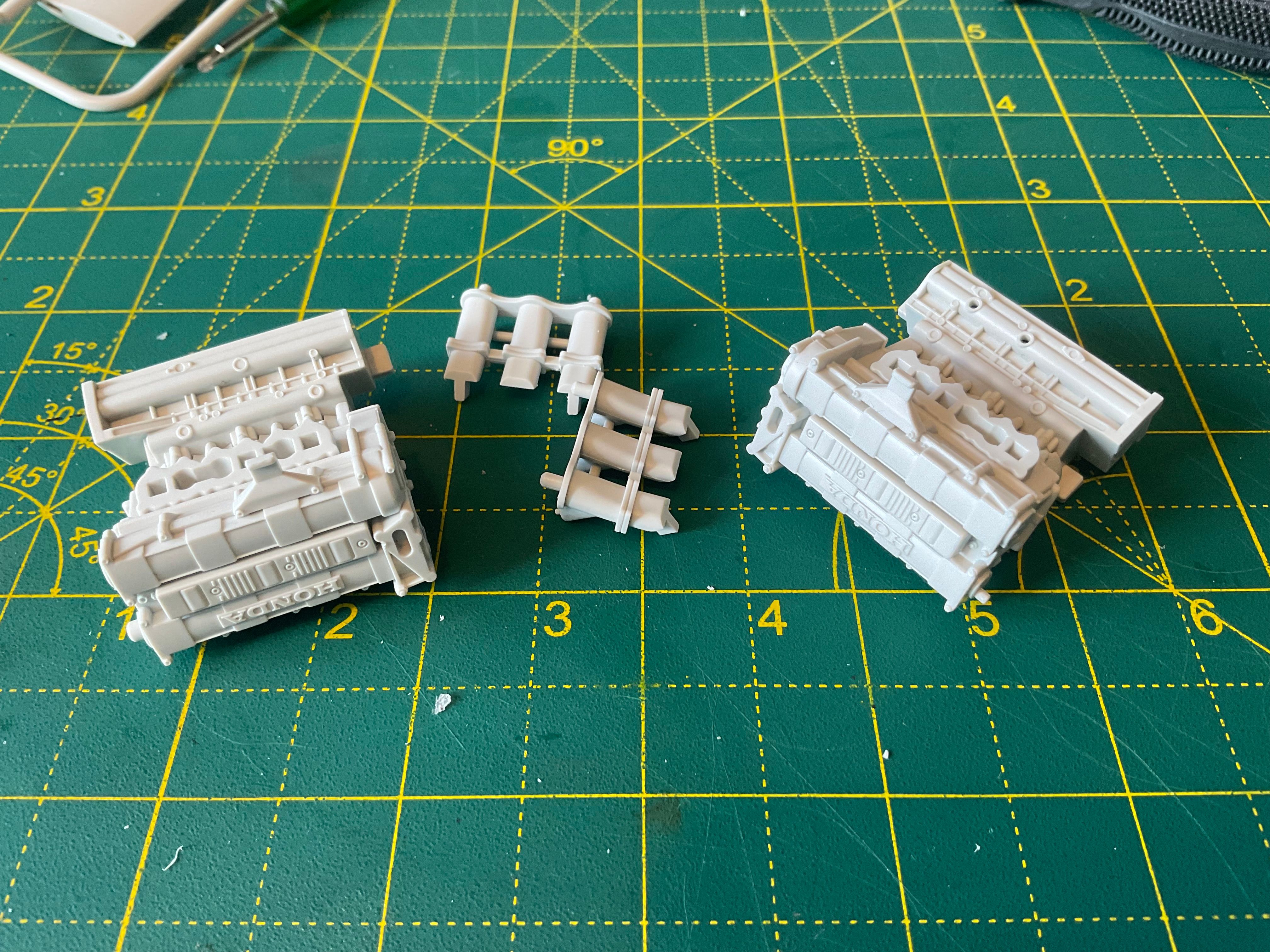 Assembly starts with the Honda's RA168E 1.5-litre V6-turbo. Lots of parts most of which end up black. The kit calls for gloss black, but reference photos and the absolutely excellent Jay Emm deep dive video on YouTube suggest semi gloss black is the way to go. Tamiya semi gloss is a little too gloss, so I mixed in a little flat black too.