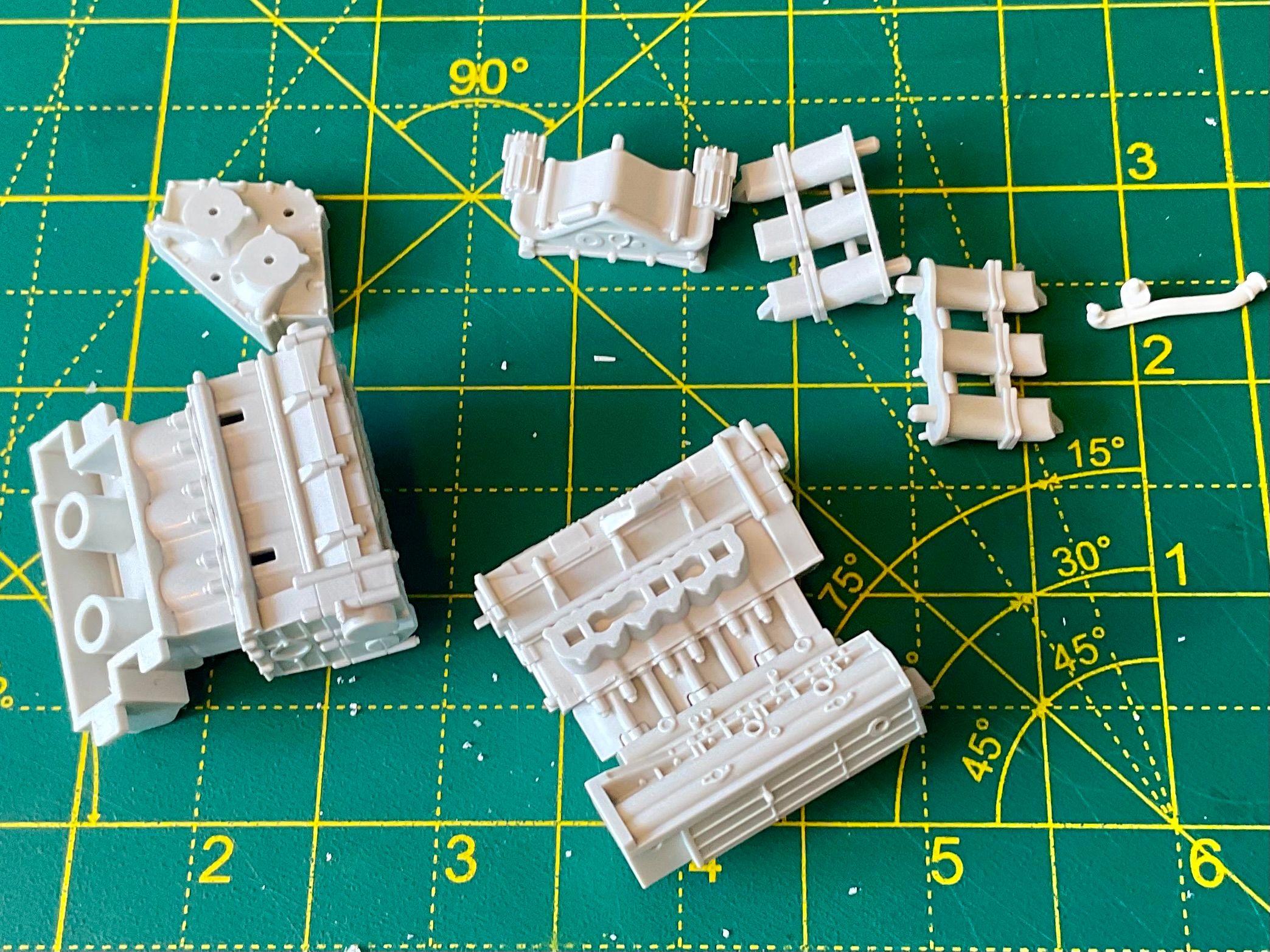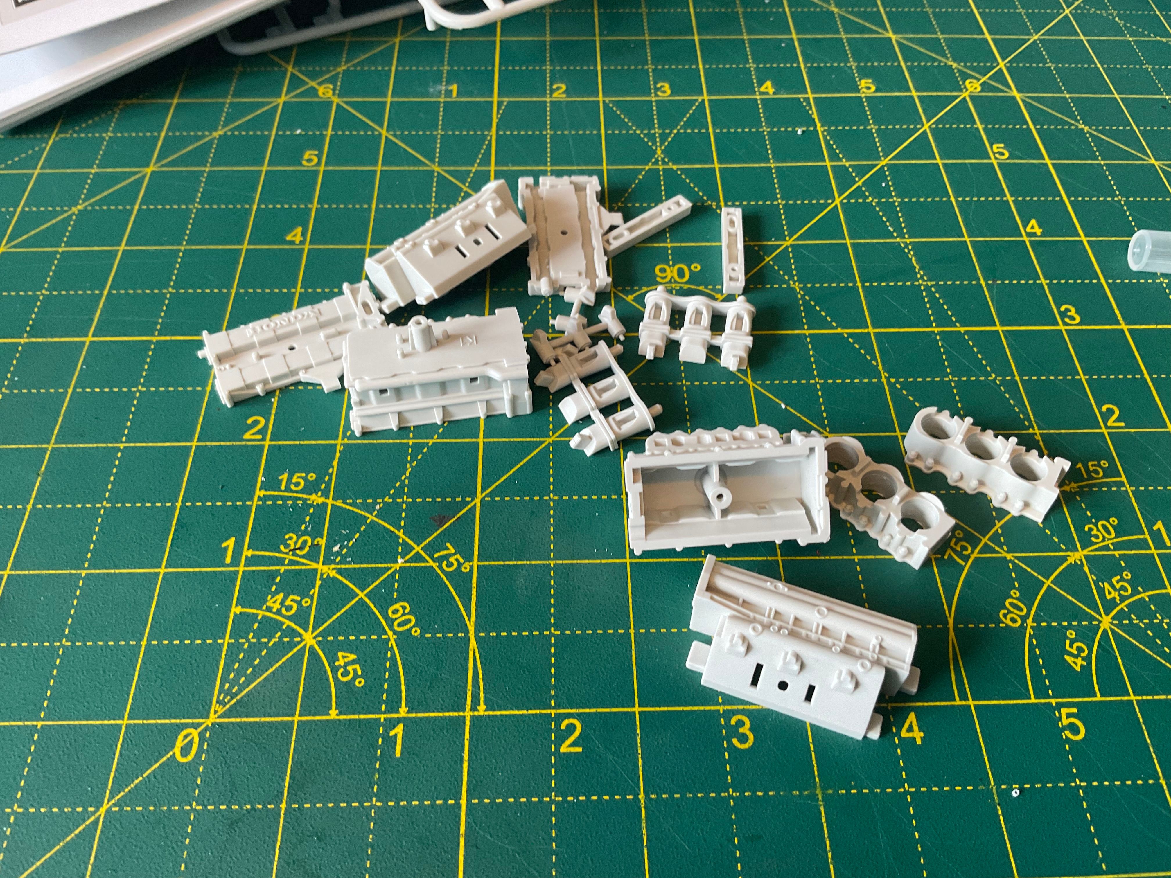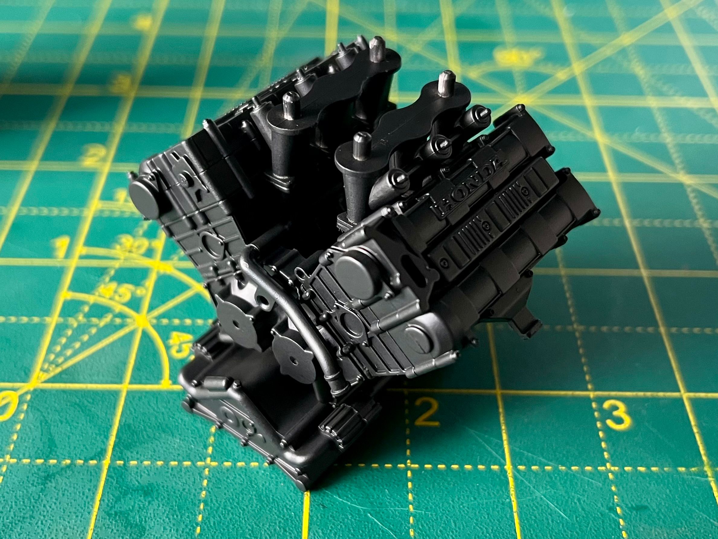 Assembly starts with the Honda's RA168E 1.5-litre V6-turbo. Lots of parts most of which end up black. The kit calls for gloss black, but reference photos and the absolutely excellent Jay Emm deep dive video on YouTube suggest semi gloss black is the way to go. Tamiya semi gloss is a little too gloss, so I mixed in a little flat black too.