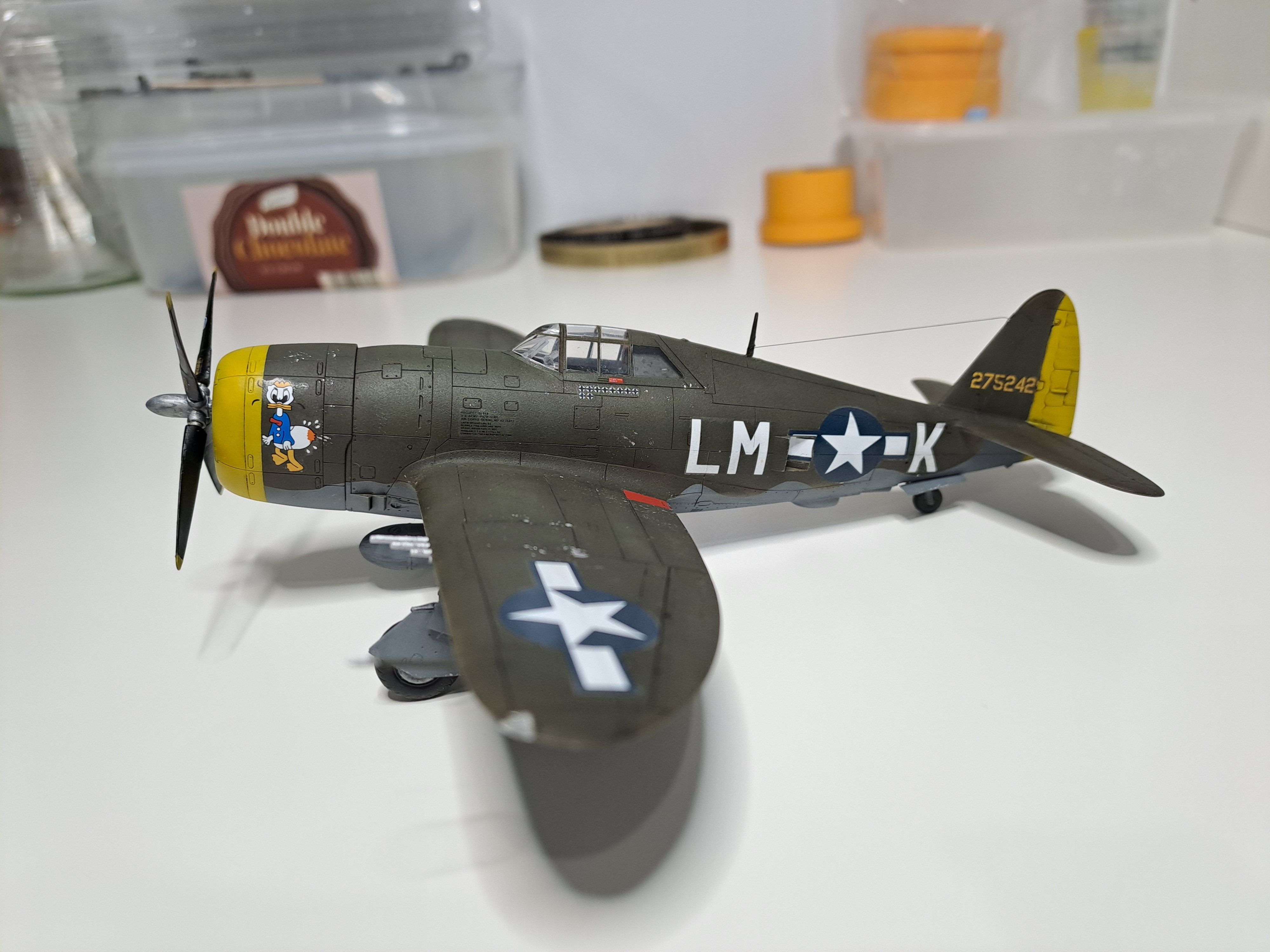 All out of the box, apart from the after-market decals depicting the aircraft of Michael Quirk, 62nd FS- chosen as I love the contrast of the yellow with the Olive Drab. I've always preferred the earlier P47s / P51s compared to the later 'bubbletop' versions- I just think they look superb