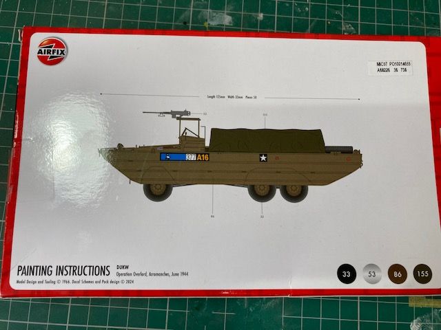 Another oldie and (possibly) a goldie. Airfix recently reissued their venerable (1966) 1/76 DUKW kit as a starter kit with paints and a brush. I picked this one up in my local Lidls for about £6.00 only a few months ago. As the mould dates back almost 60 years, Airfix should really have included this as part of their "Vintage Classic" range. However, depsite its age, the mould seems to be in good shape and there were no fit issues, at all.
