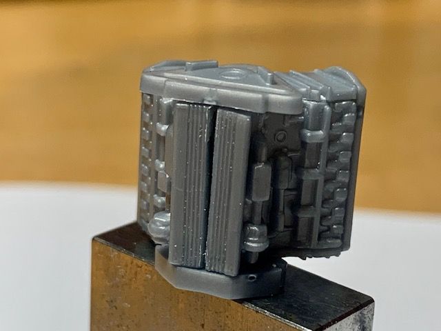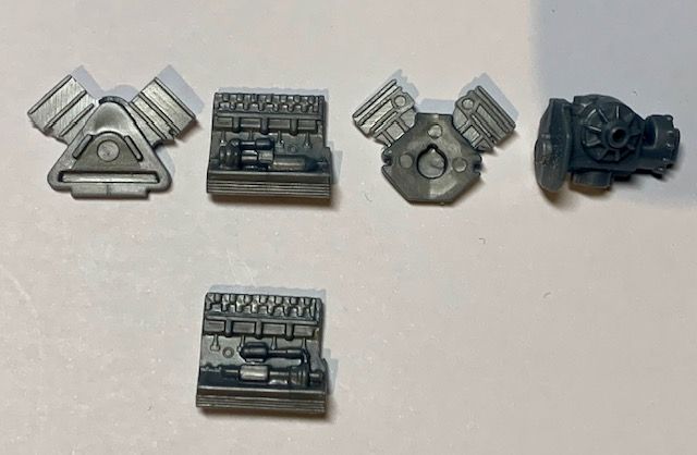 Now the first problem: the engine. Judging by the position of the coolant pipes and where the disappear into the block, I think there's an error in the instructions in that the engine sides are the wrong way around. As shown below is how I think it should be (lower side fits on the right side of the engine). Luckily the location points (not that they amount to much) are identical left-to-right, so it's possible to swap them without much hassle: