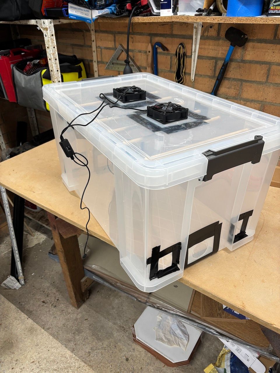 Inspired by this thread and a previous conversation with a friend about biltong, I am not long after seasoning some meat to leave overnight in the fridge. I built a very haphazard box featuring some seriously brittle plastic against my hamfisted drilling but should be fine.