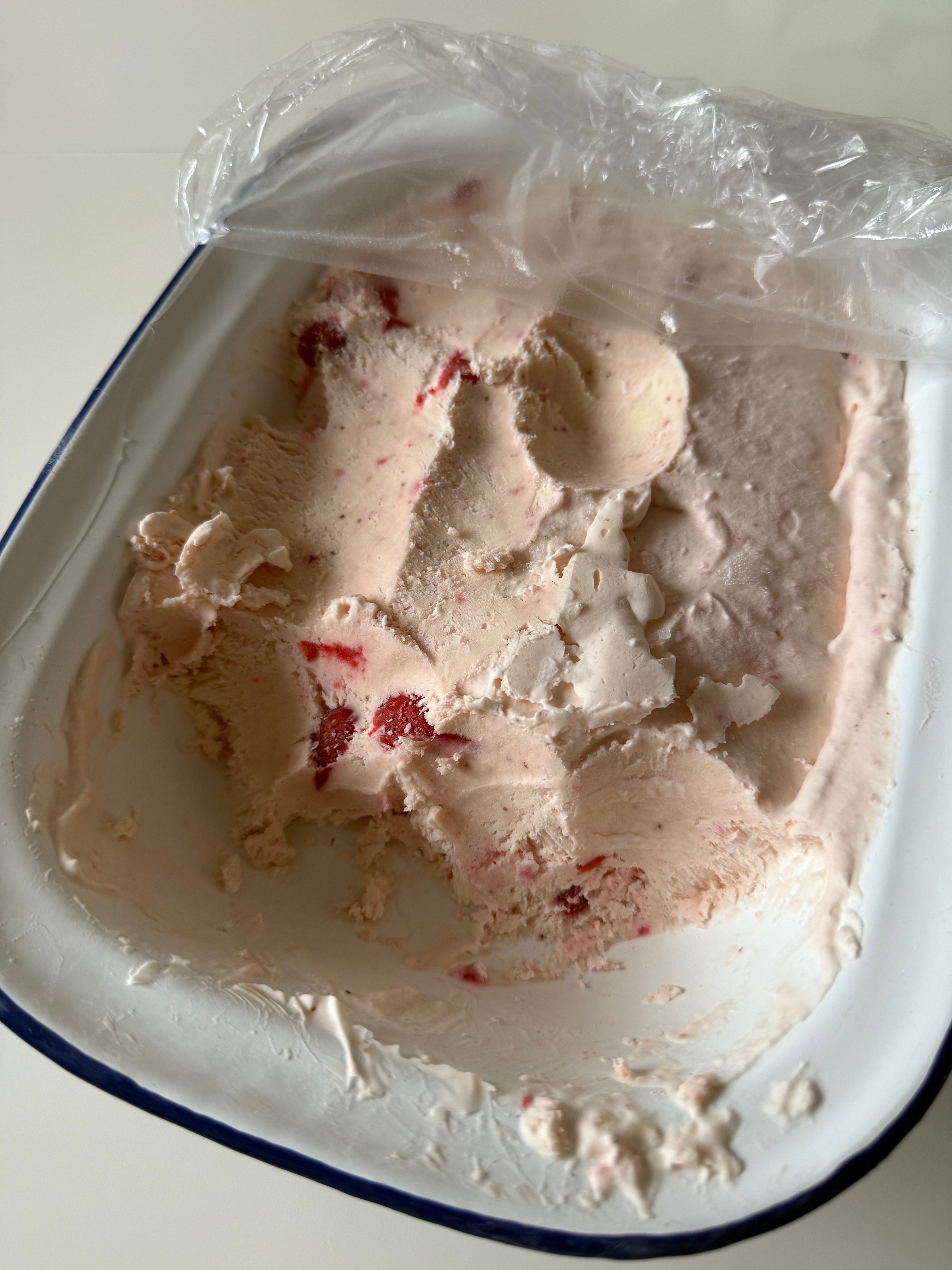 500 ml double cream, 200 ml sweetened condensed milk and whatever you want for flavour...I chose strawberry. I literally beat the cream into stiff peaks, folded in the condensed milk, blended a punnet of strawberries, folded that in, and then threw in a few more chopped up strawberries. Into a pie dish (yeah, whatever) cover and bang it in the freezer overnight.
