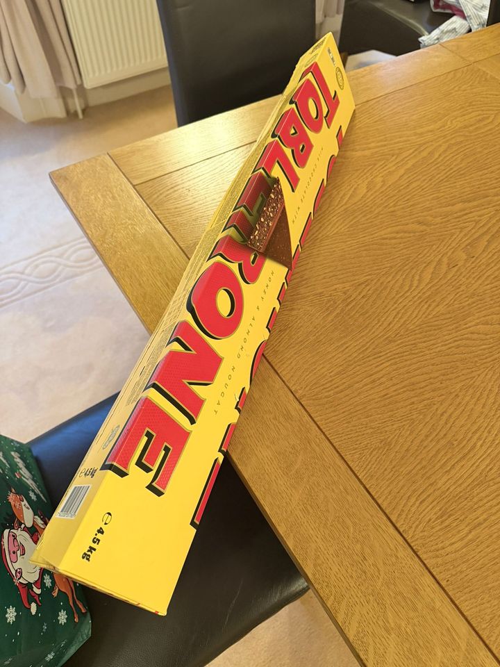 I was given a 4.5kg bar of Toblerone for Christmas, I ate a whole triangle last night which is 375g and 2,000 calories. So 24,000 calories in the whole bar.