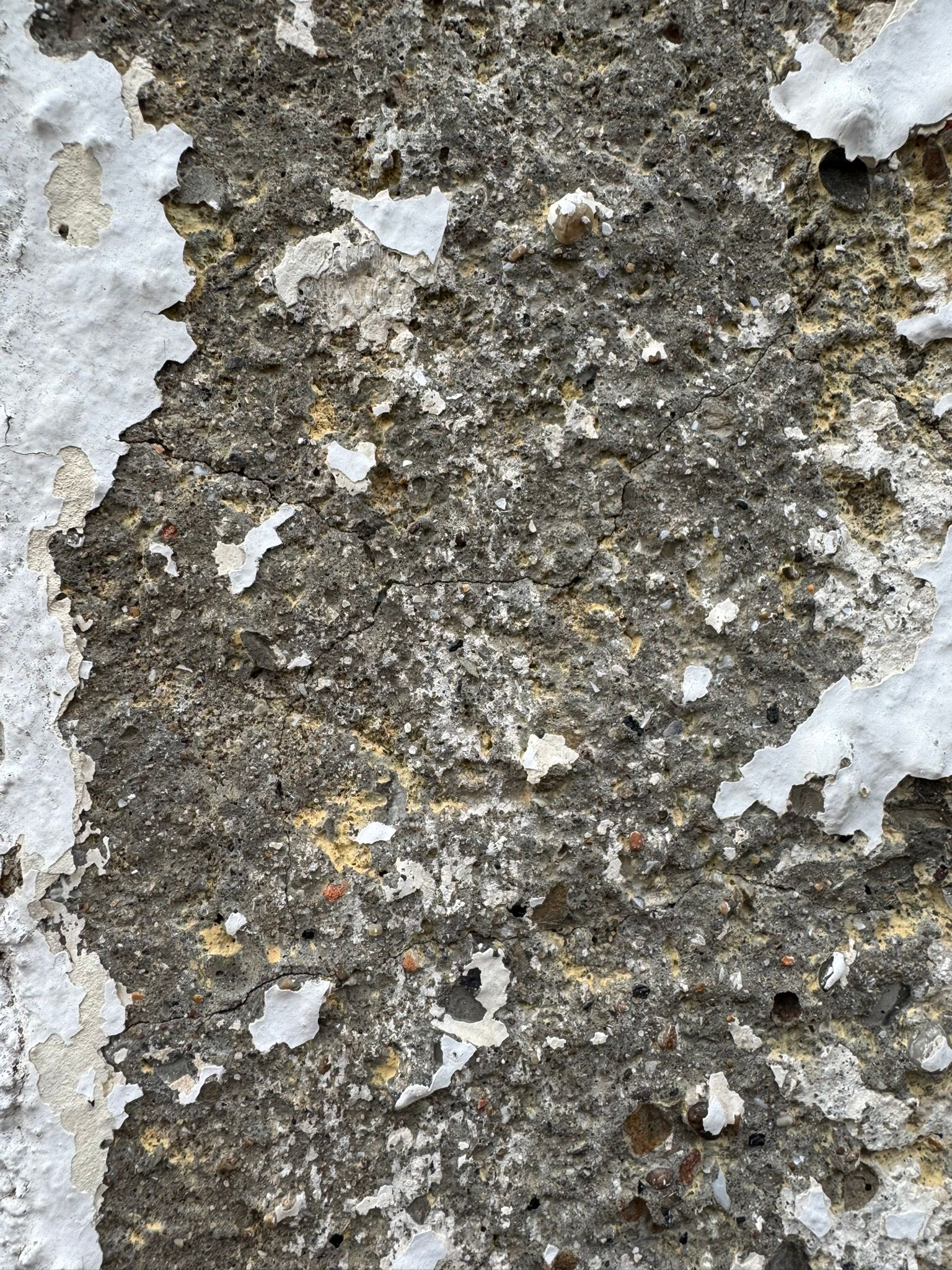 On the exterior of the same area, I have removed some of the paint to get a better look. There are many layers of paint on the front face of the building that have been added over the years. The paint is blown and I guess water can easily get in behind. Obviously, it looks pretty bad following my quick paint removal job.