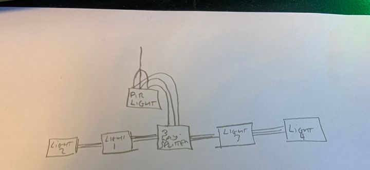From the splitter box there is a cable that goes each way, one way to lights 2 and 3 and the other way to lights 4 and 5, between each light there is a connecting cable so lights 2 and 4 have 2 lots of wiring into them.