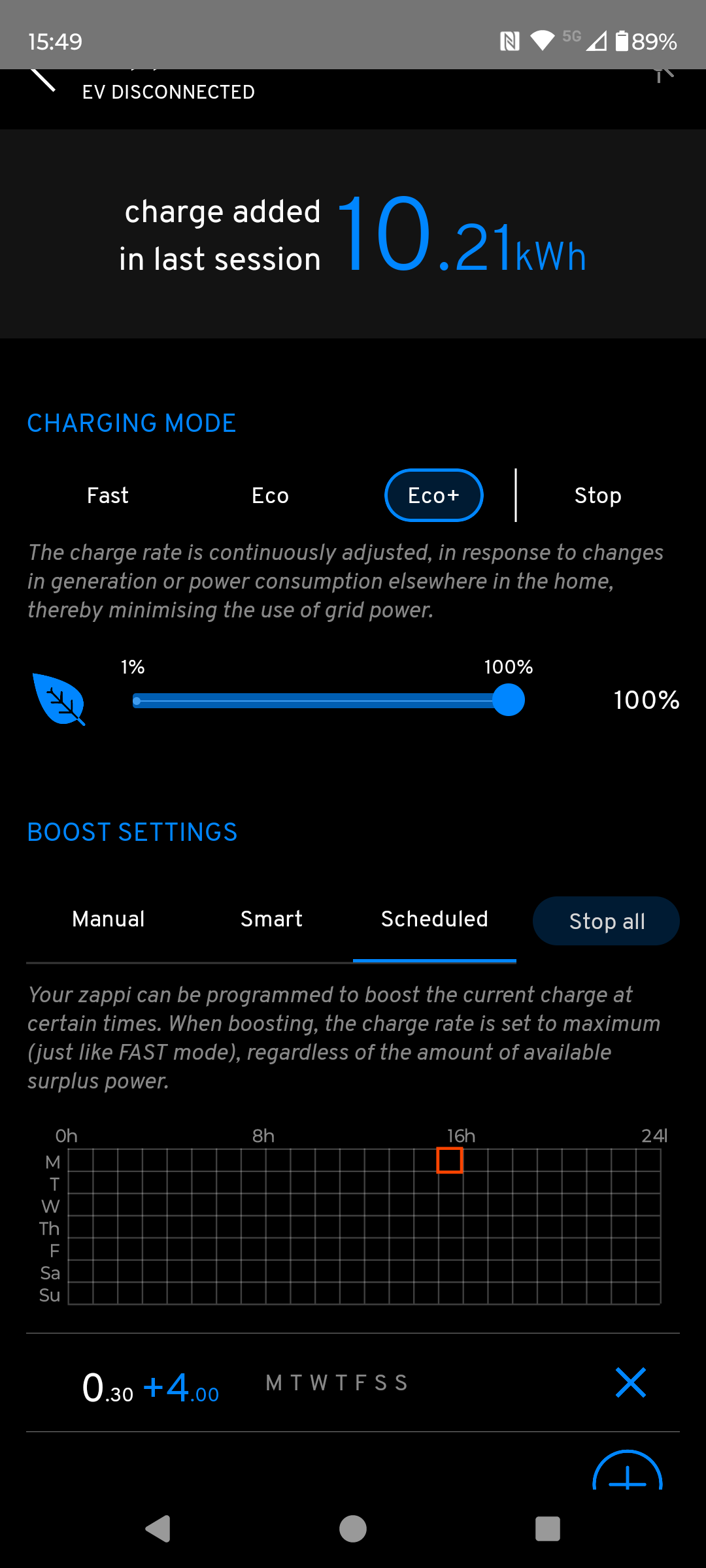I don't want to unpair my device and re-pair it in case it goes all wrong but in your MyEnergi app you need to remove the schedules and set it to Eco+ mode. If charger integration is set up correctly, when you plug in your car, the Octopus app will notify you with a planned charging schedule for that night. This is based on the stated car battery should be functional for whatever car you plugged in.