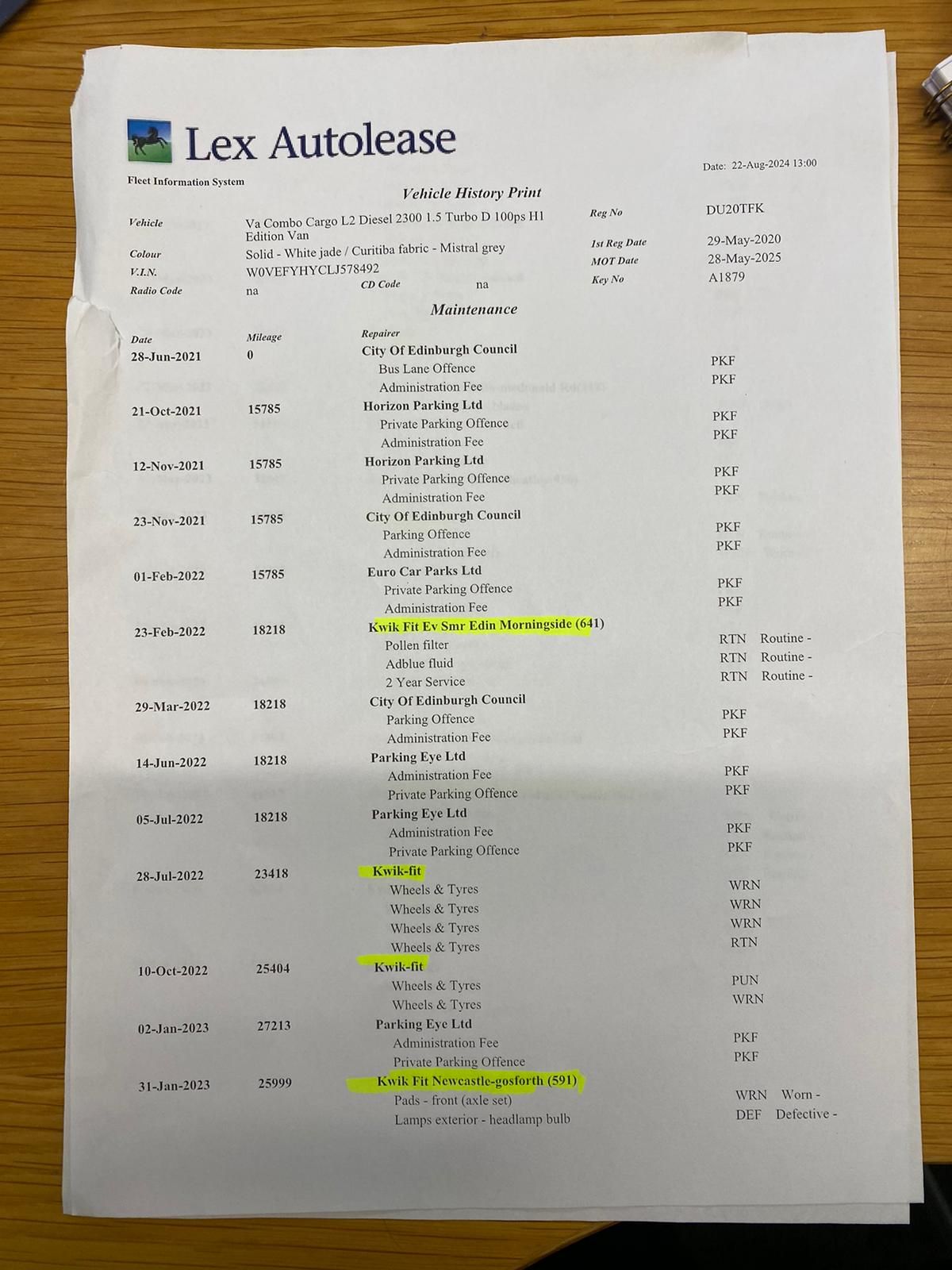 I'd guess it looks fairly standard for a lease van. Looks like the first user was based out of Edinburgh and then second user somewhere in Yorkshire/North East. Bear in mind that the servicing will have been fairly minimal as it's been done by fast fit places rather than the dealer - fairly common for lease vans and cars these days though.