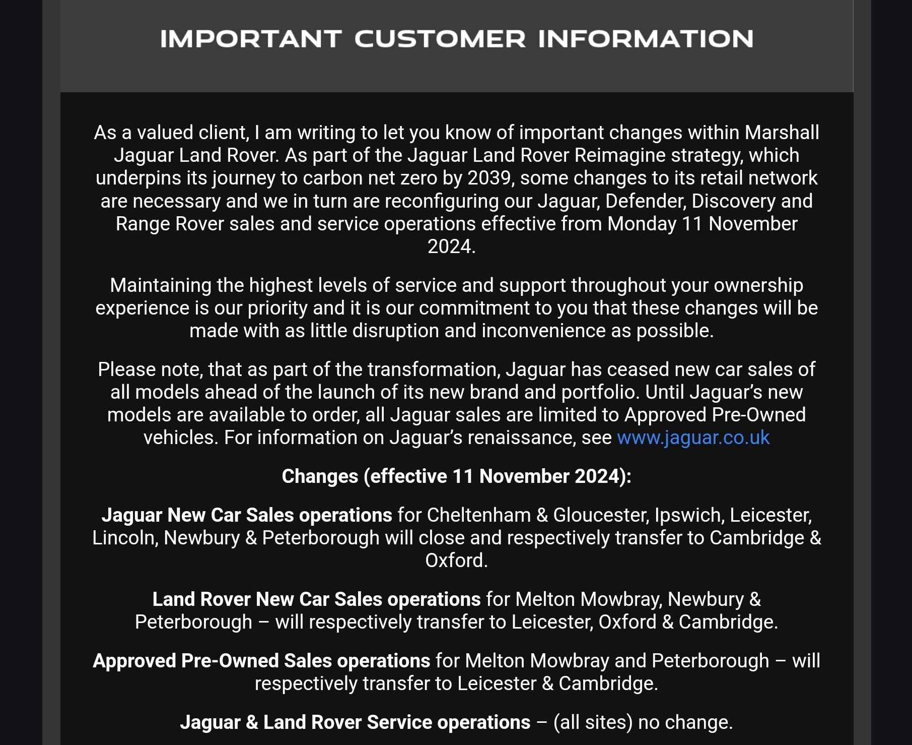Just had an email regarding change to the JLR network/closures.