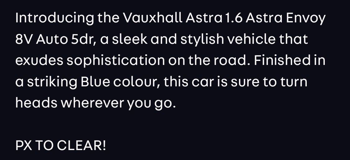 Five paragraphs of waffle & the only details directly relating to the car - colour, mileage, year & hp. Nothing about service history, warranty, specs, length of MOT etc etc...