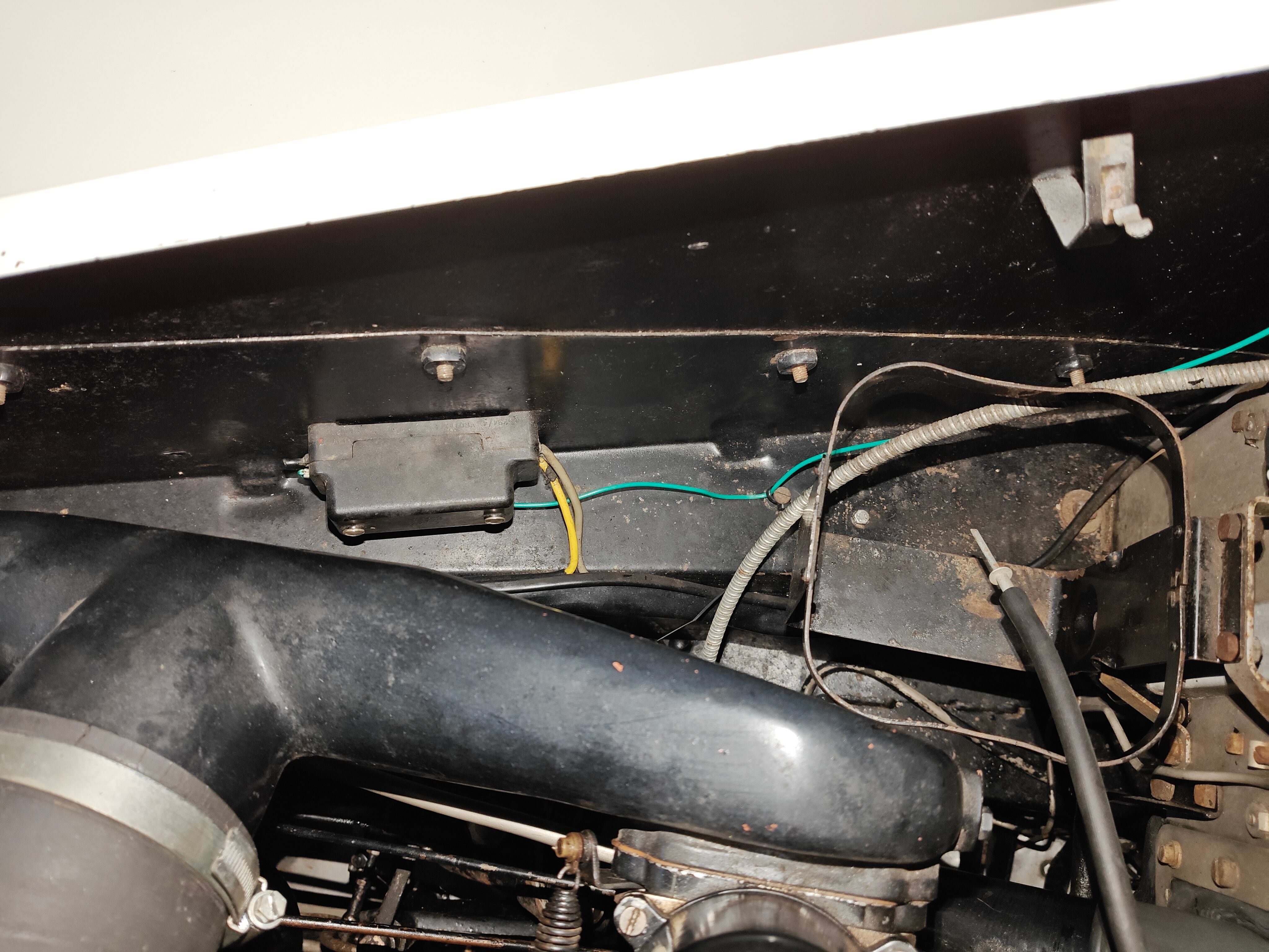 So job number one was to fix the horn. The circuits are simple, battery (remember, POSITIVE EARTH!), switch, relay, horns. I always start diagnostics at the relay which in this case is the big chunky box here with wires going into it.