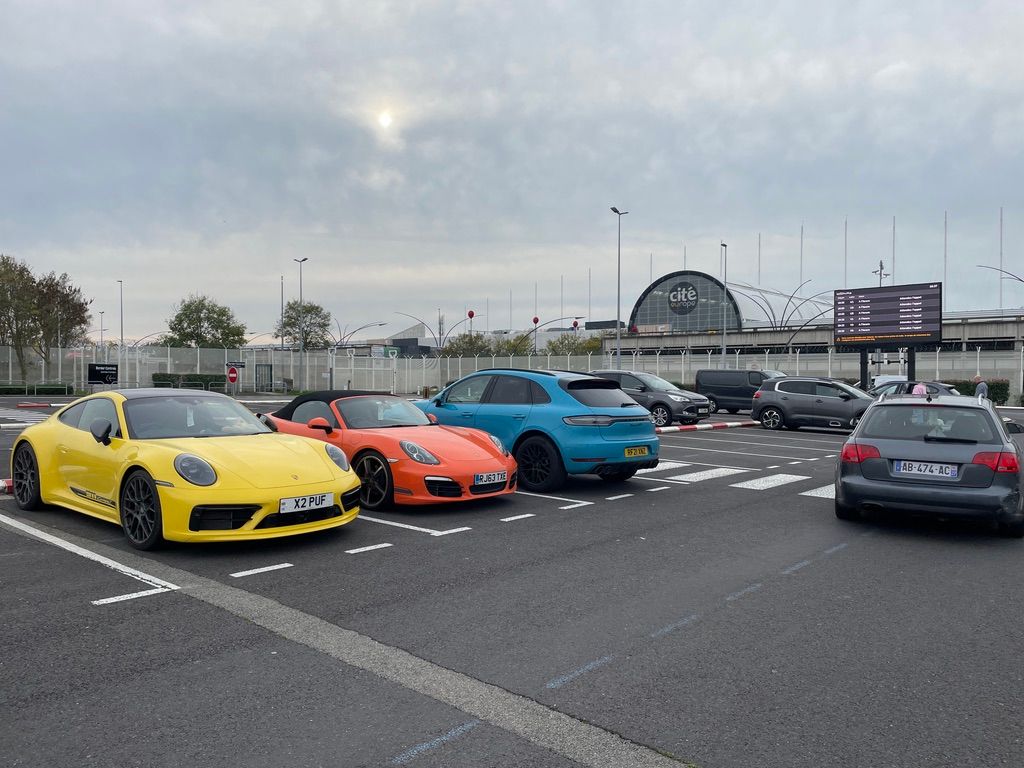 Lovely car and I agree that sports cars should be in bright colours. Here I am at Calais Shuttle last weekend, waiting to return to the UK. Two other random Porsche owners parked at the terminal waiting to get home. Everything else was black, white or grey!