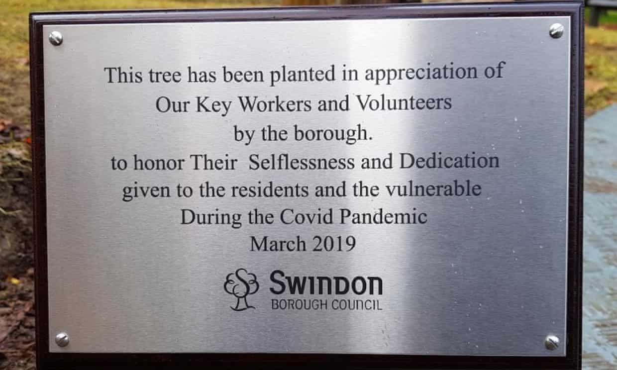 Hope they tidy up the grammar as well. Shouldn't it start "This tree has been planted by the borough .... etc". Or perhaps: "This tree has been planted in appreciation of the borough's key workers .... etc"?