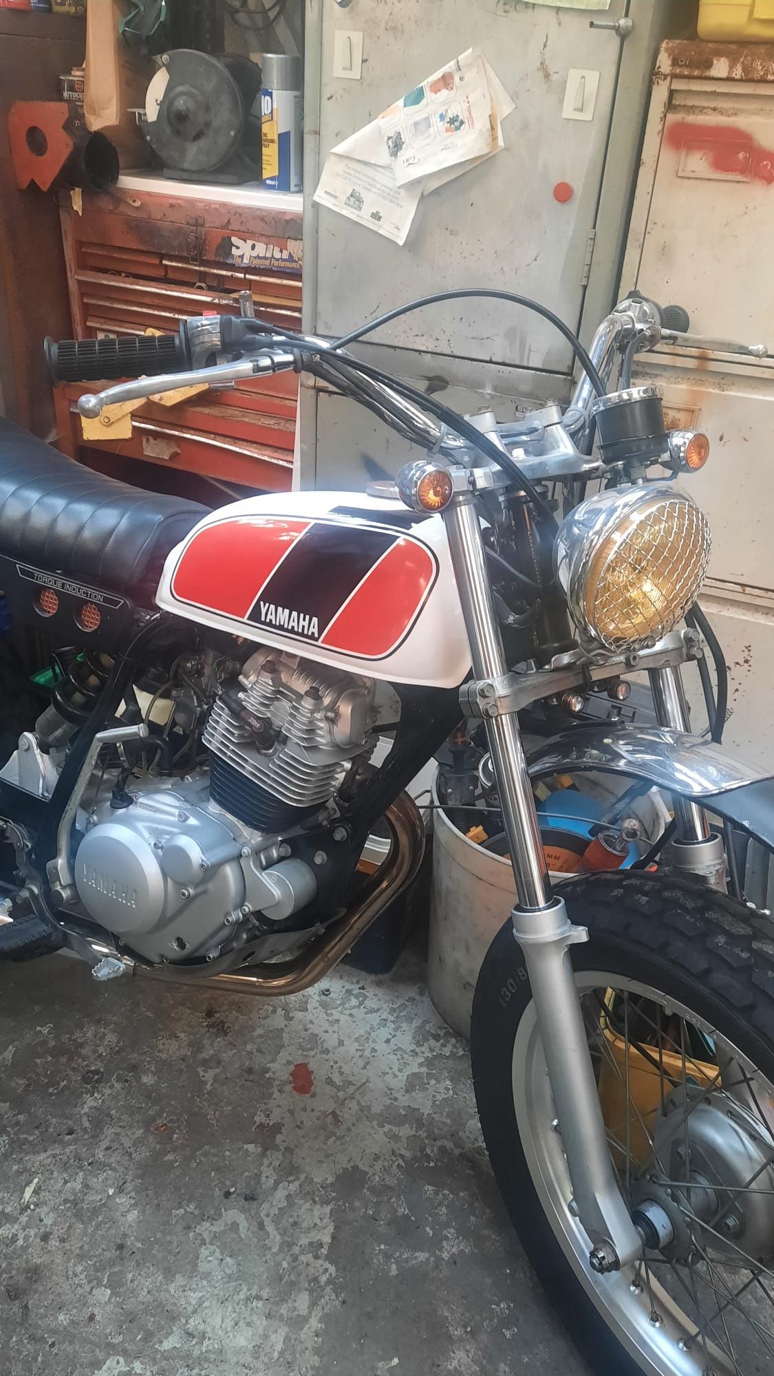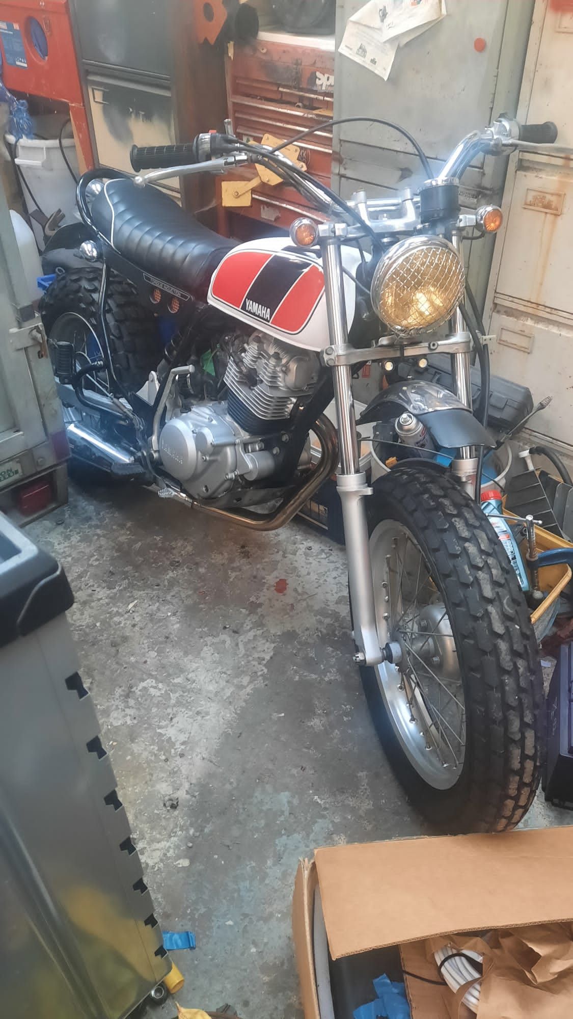 And has an electric starter ! As janluke says looks like a tw200 , drum brakes, monoshock , electric start , balloon tyres . I don't think the Yam is as big as 500, the SR/XT engines you refer to had a window on the end of the cam housing to determine tdc, and were a lot taller & chunkier.