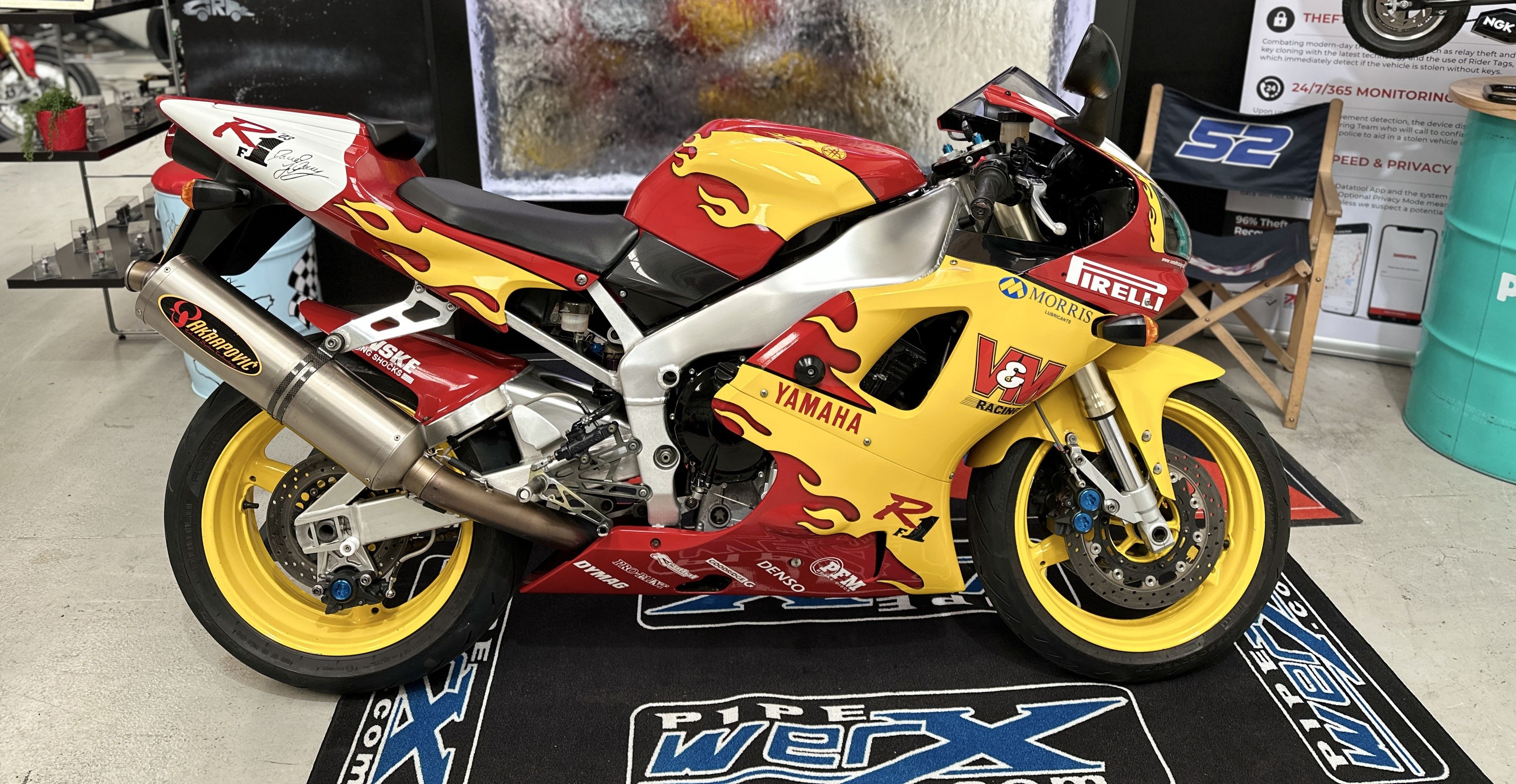 That is a lovely find! Would it be rude to ask how much you paid for it (I have thought about getting an early R1 myself)? I know the V&M colours a very marmite but as a TT fan, I always thought it was awesome. It's a 1 owner from new bike bought in 2000, last of the 4XV's for sale, 11500 miles, and was sent down to V&M for a few tweeks; full Akrapovic exhaust, reprofiled cams (around 159 bhp at the wheel last time dyno'd), Penske rear shock, Maxton tweeked forks and a Maxton steering damper, LSL rearsets plus the airbrushed paint. It has Dave Jefferies signature on the nose and both sides of the seat unit. All the original parts came with the bike too.