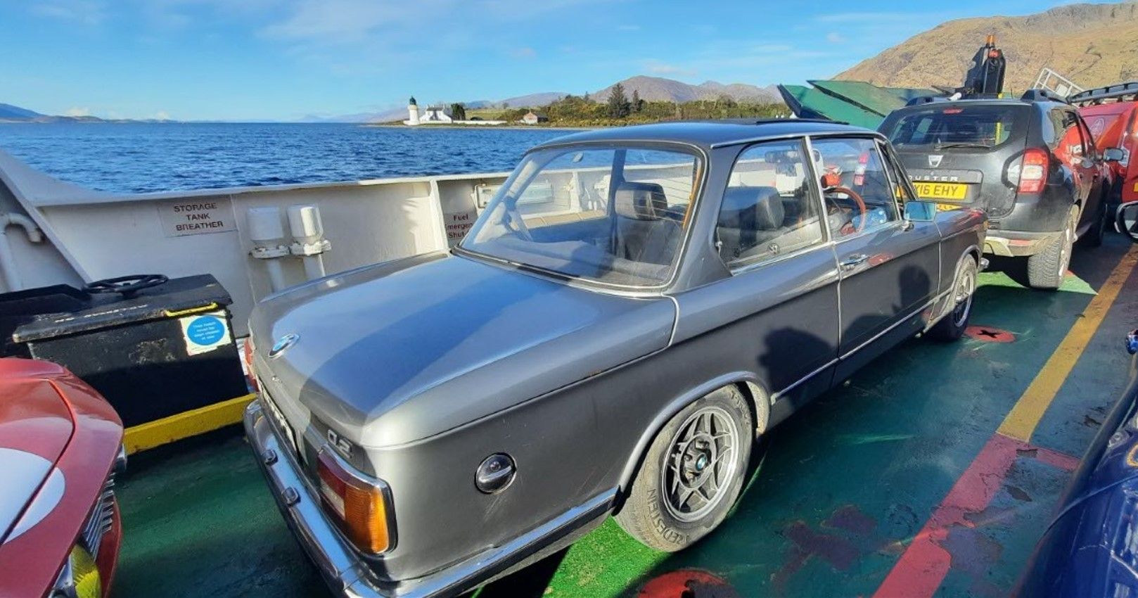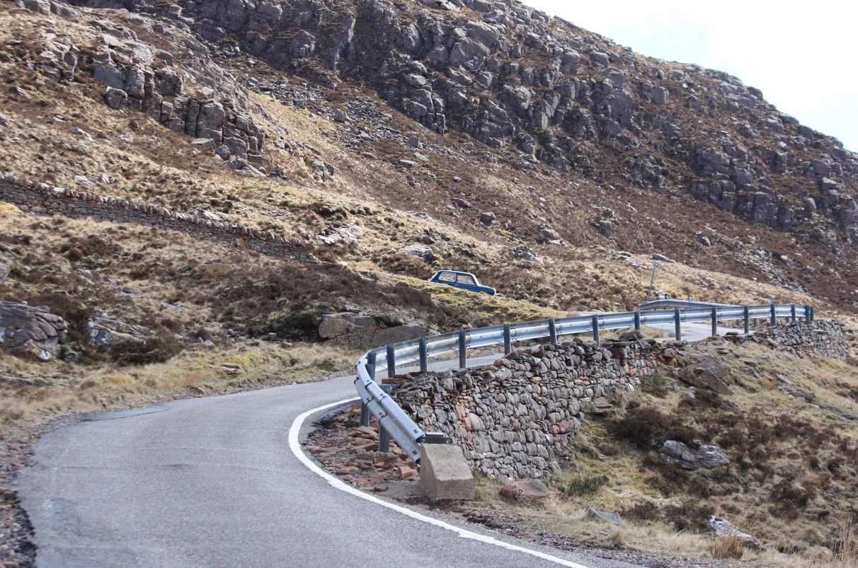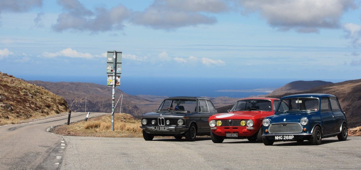 I can only write from my own accounts, so... The little BMW had me suffering on Day 3 from intense cabin Fumes (both oil and fuel). I had suffered this in the past from bad valve stem seals, since fixed but it brought back bad memories of carbon monoxide poisoning. So, back to the evening of day 3, we spent some time taping up holes, adding cardboard and tape to seal the engine bay and even adding a direct fresh air duct through the front 1/4 window. Day 4 was the one day we could significantly cut the route shorter, so I took the opportunity. Something didn't sit right with me going further North with a potential problem. To skip to the end... The overnight fixes had worked perfectly and all fumes were gone. However not knowing this we headed out together to the supercar road, the A832 from Kinlochewe to Achnasheen and Beyond. A fantastic road but for our wee classics a bit too long and straight. Top speeds could (in theory) be reached in no time at all.