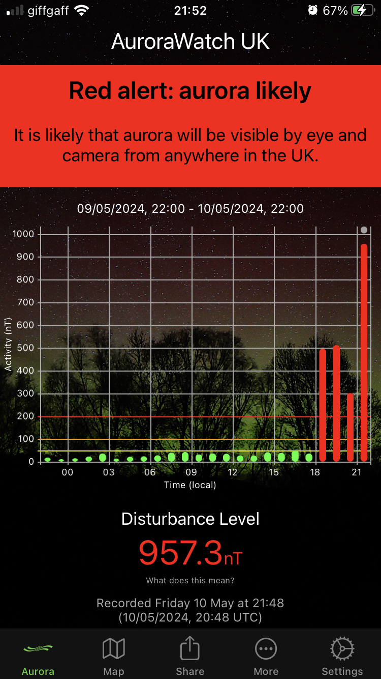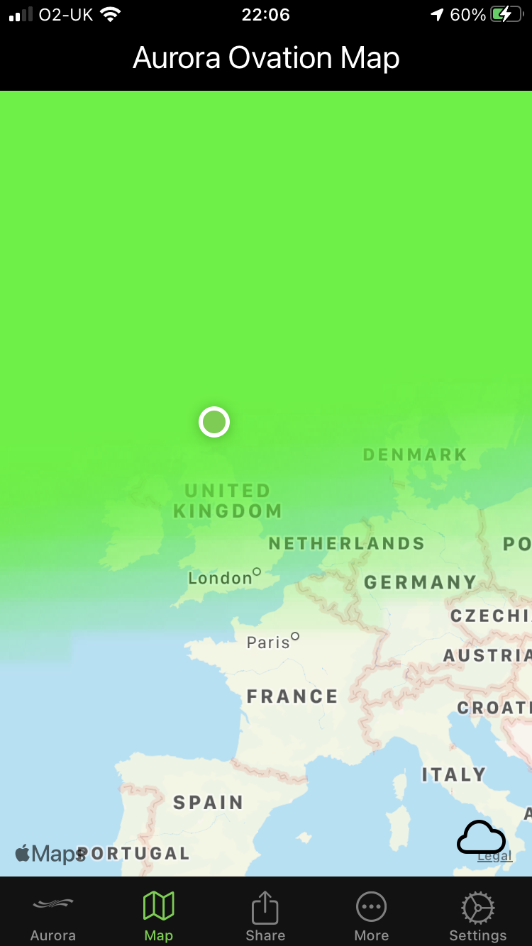 I guy I follow on Facebook who goes all over watching them and had a few pics on Sky News the other week of it from Snowdonia has said it is pretty much guaranteed in UK straight after darkI'm getting a bit of green if I use the Slow Shutter app on my iPhone but nothing much for the naked eye yet. If it starts to look promising I'll walk to somewhere about 15 minutes away where I can get a good view. I've been out for a walk but the route I took was bligted by those wretched new white street lamps.