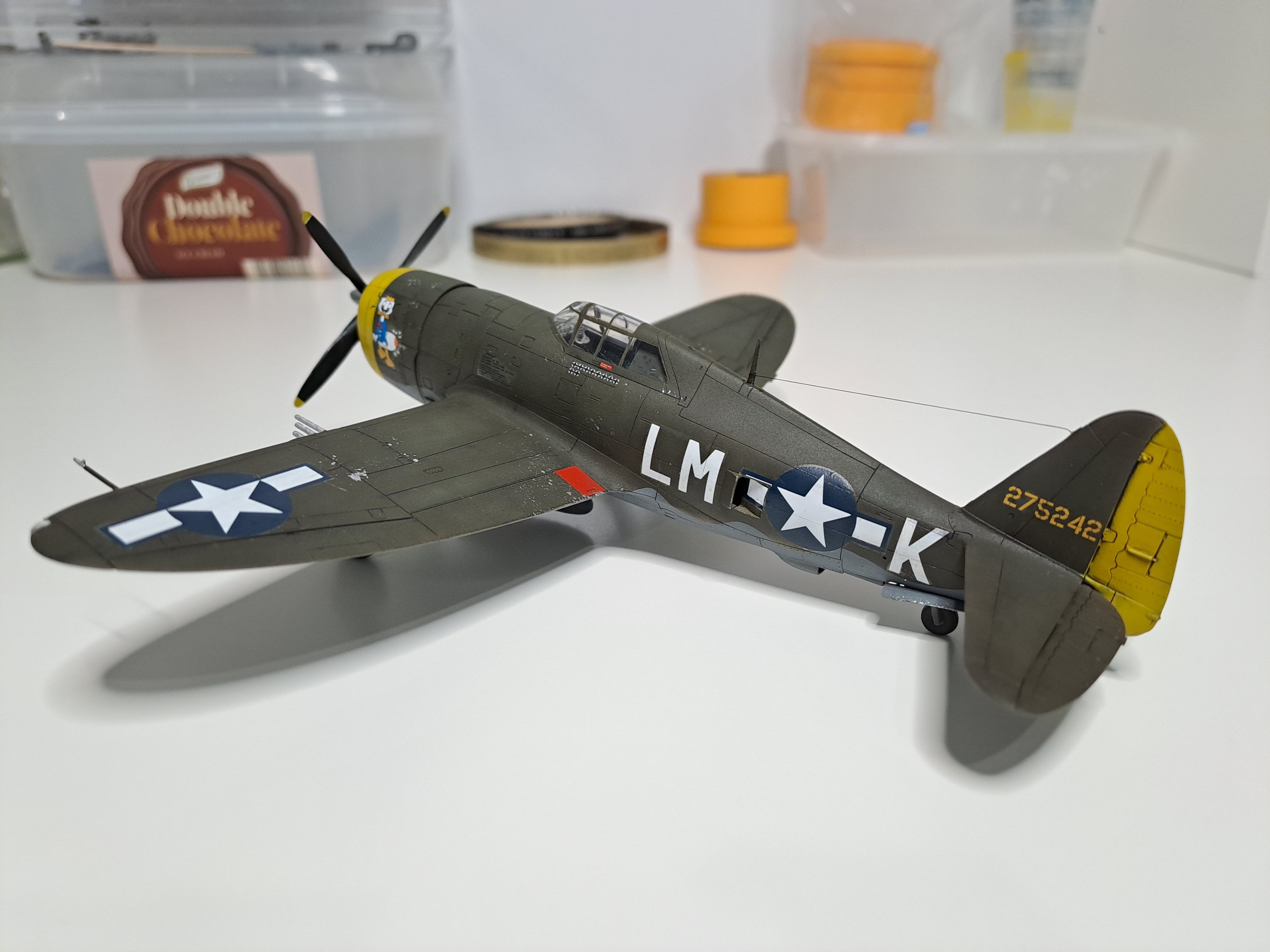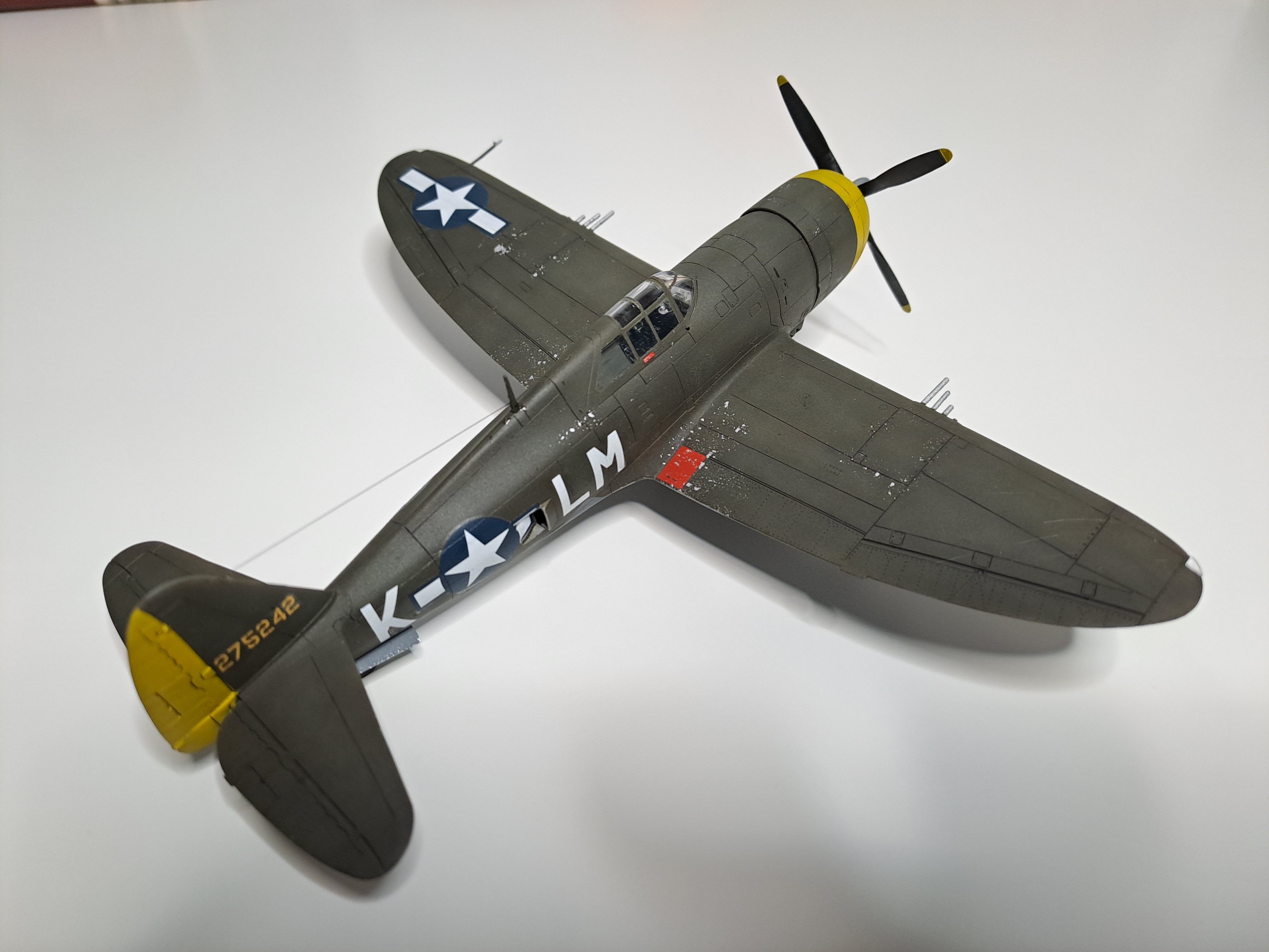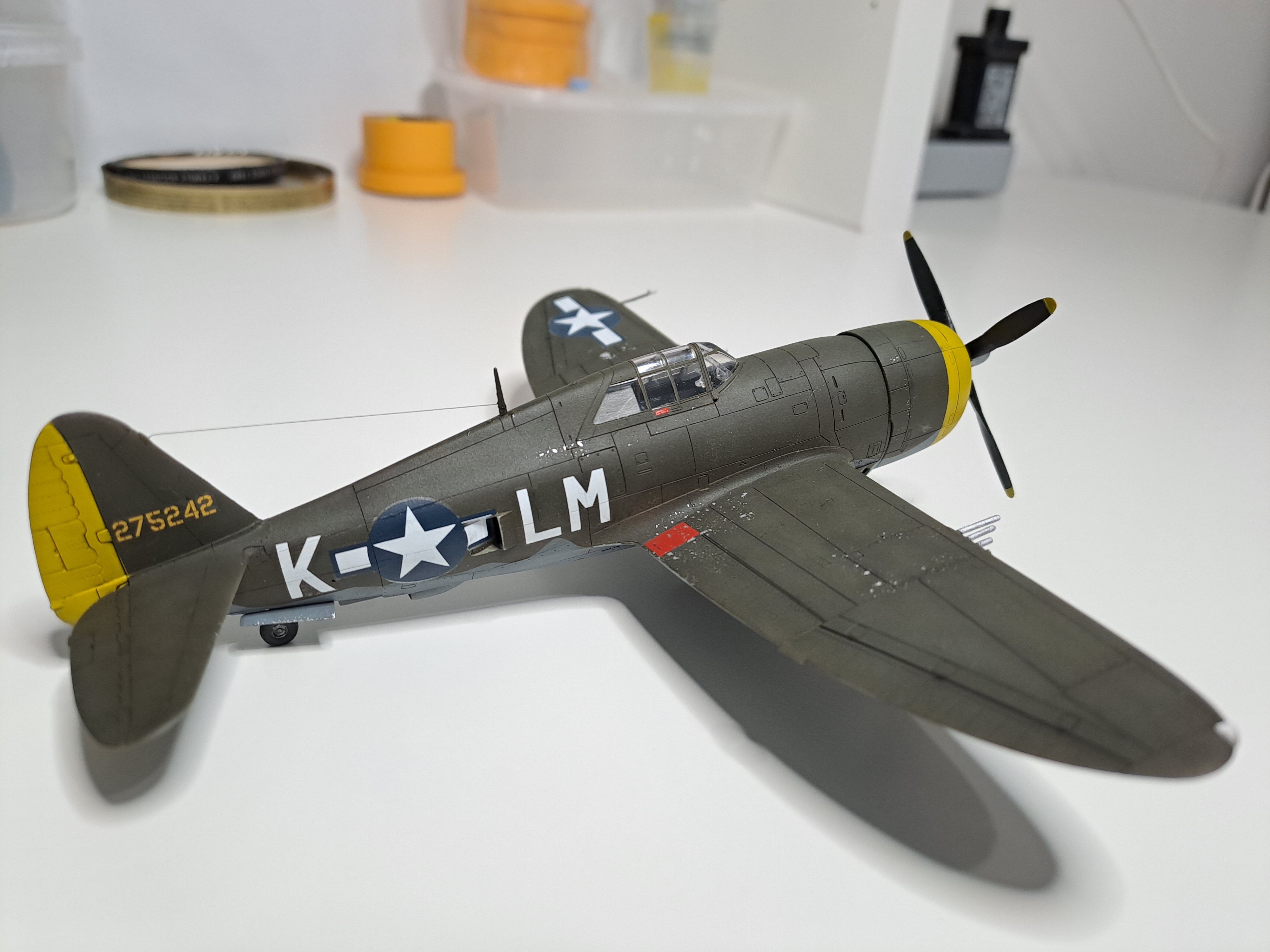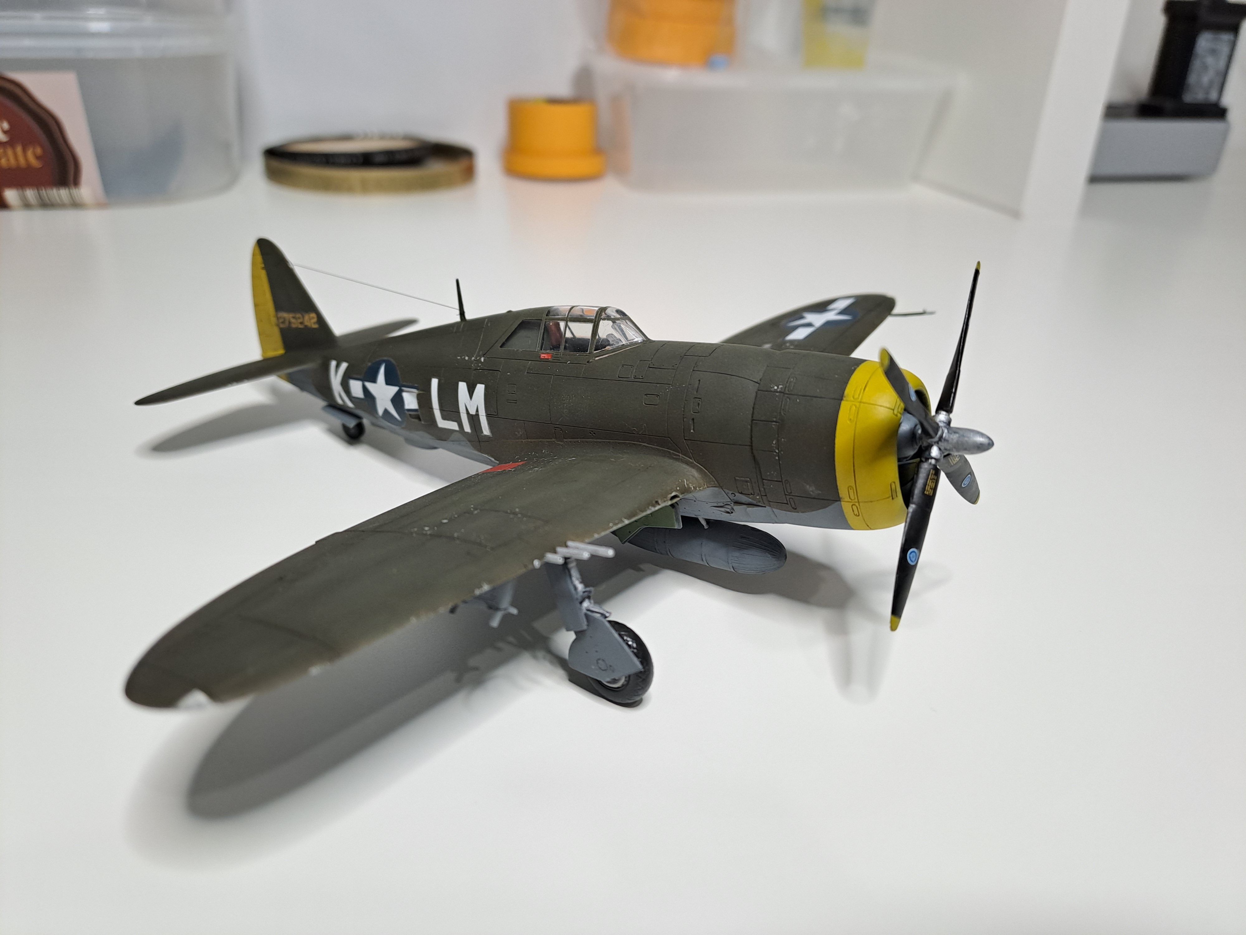 All out of the box, apart from the after-market decals depicting the aircraft of Michael Quirk, 62nd FS- chosen as I love the contrast of the yellow with the Olive Drab. I've always preferred the earlier P47s / P51s compared to the later 'bubbletop' versions- I just think they look superb cool