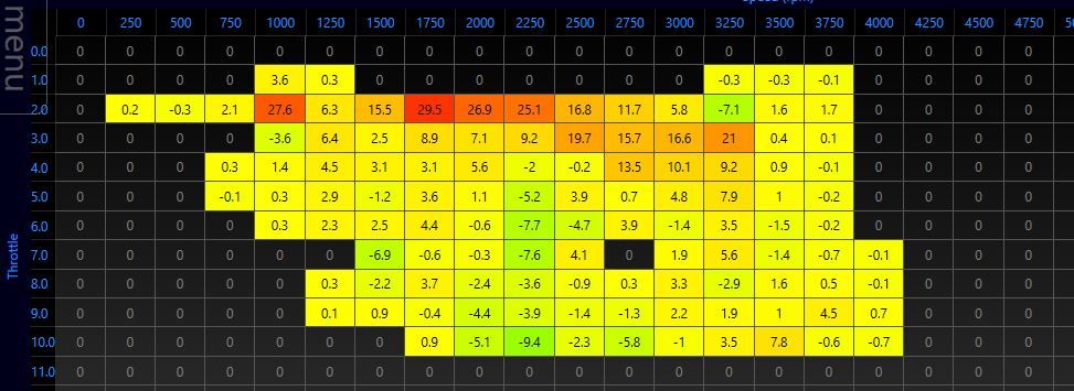 To me this is a bit more meaningful, but also does backup my thinking that the stored adaptive map looks slightly lean. I'll be giving it another 0.2 or 0.4 of a degree on the throttle pots at the next tune up.