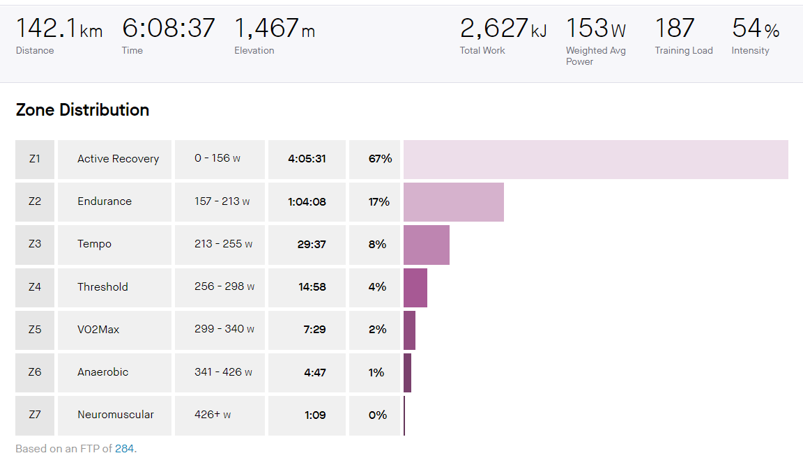 For the 78km ride above Garmin credit me with measly 4 intensity minutes (2h 15m in Z1 and 6m in Z2) on a ride that took me 3h 12m.