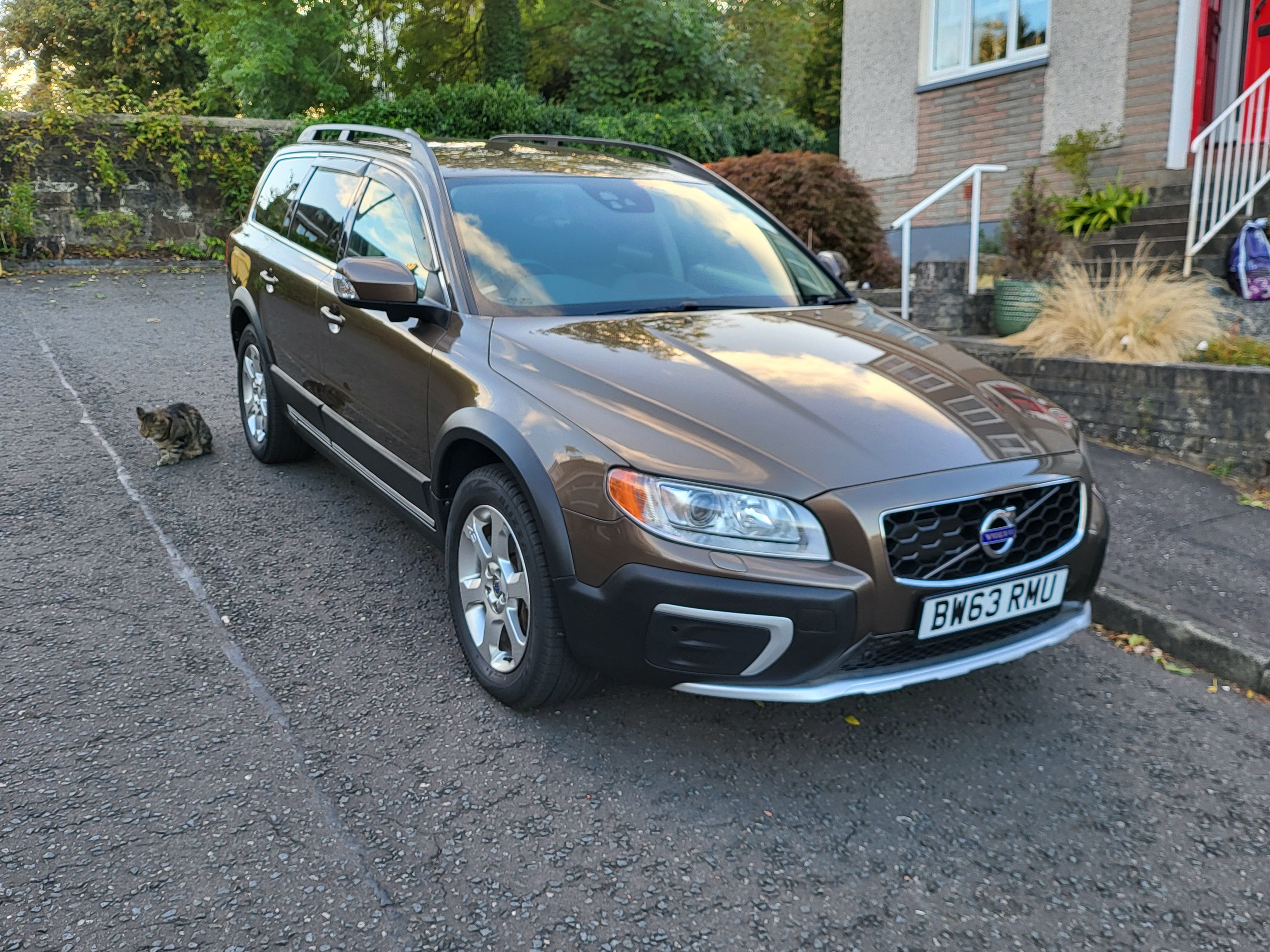 Spec wise: MY2014 Twilight bronze metallic, 72k miles, on small 17" alloys (currently on winter tires), espresso brown leather, heated/cooled seats, radar cruise and a host of safety stuff. Also came with a proper volvo badged thule roof box, removed now, might use later.