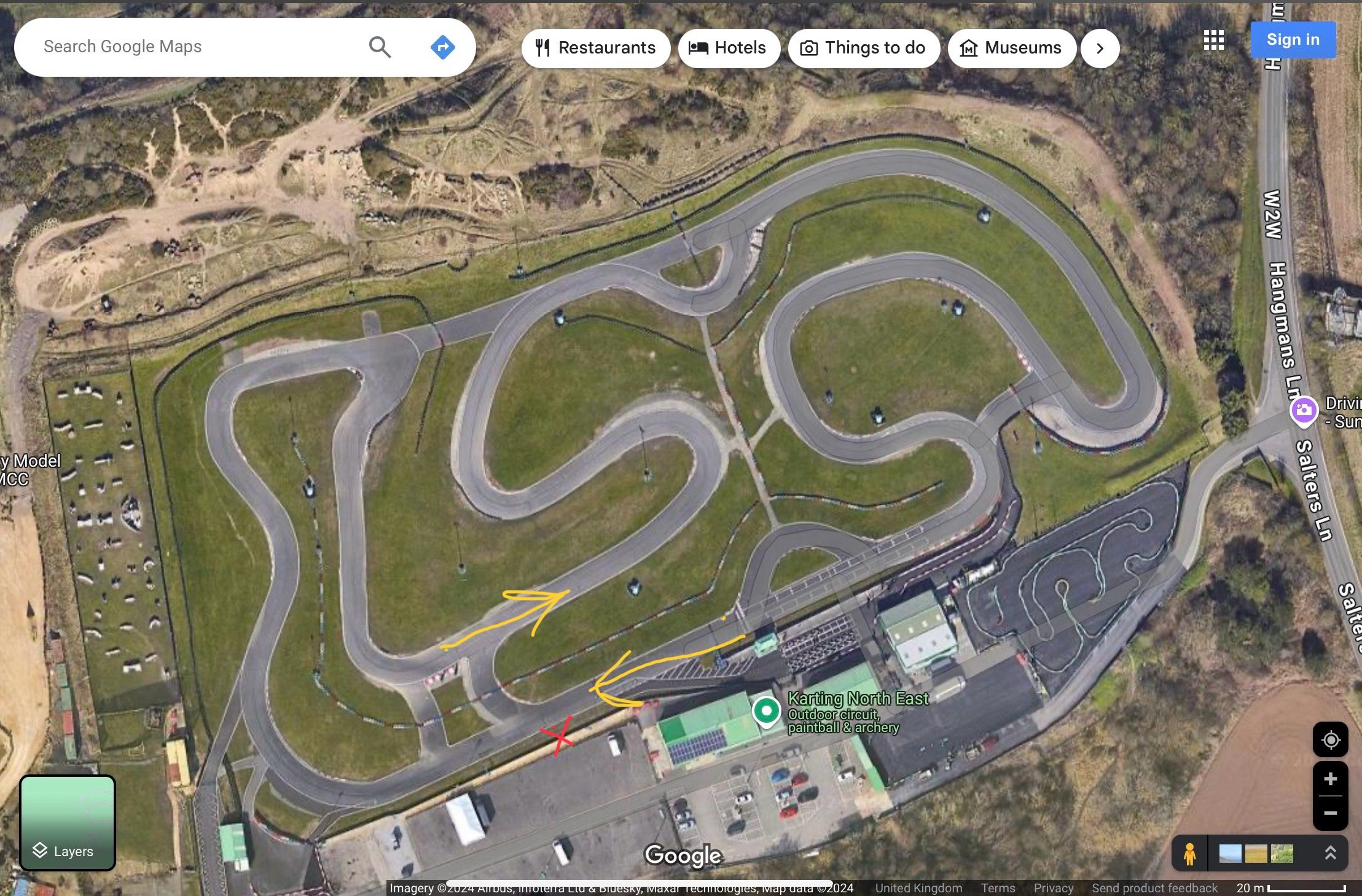 My position was on the home straight (Red Cross on map) and I was able to see the middle straight (yellow arrow pointing right) no problem and the zoom got me quite close in.