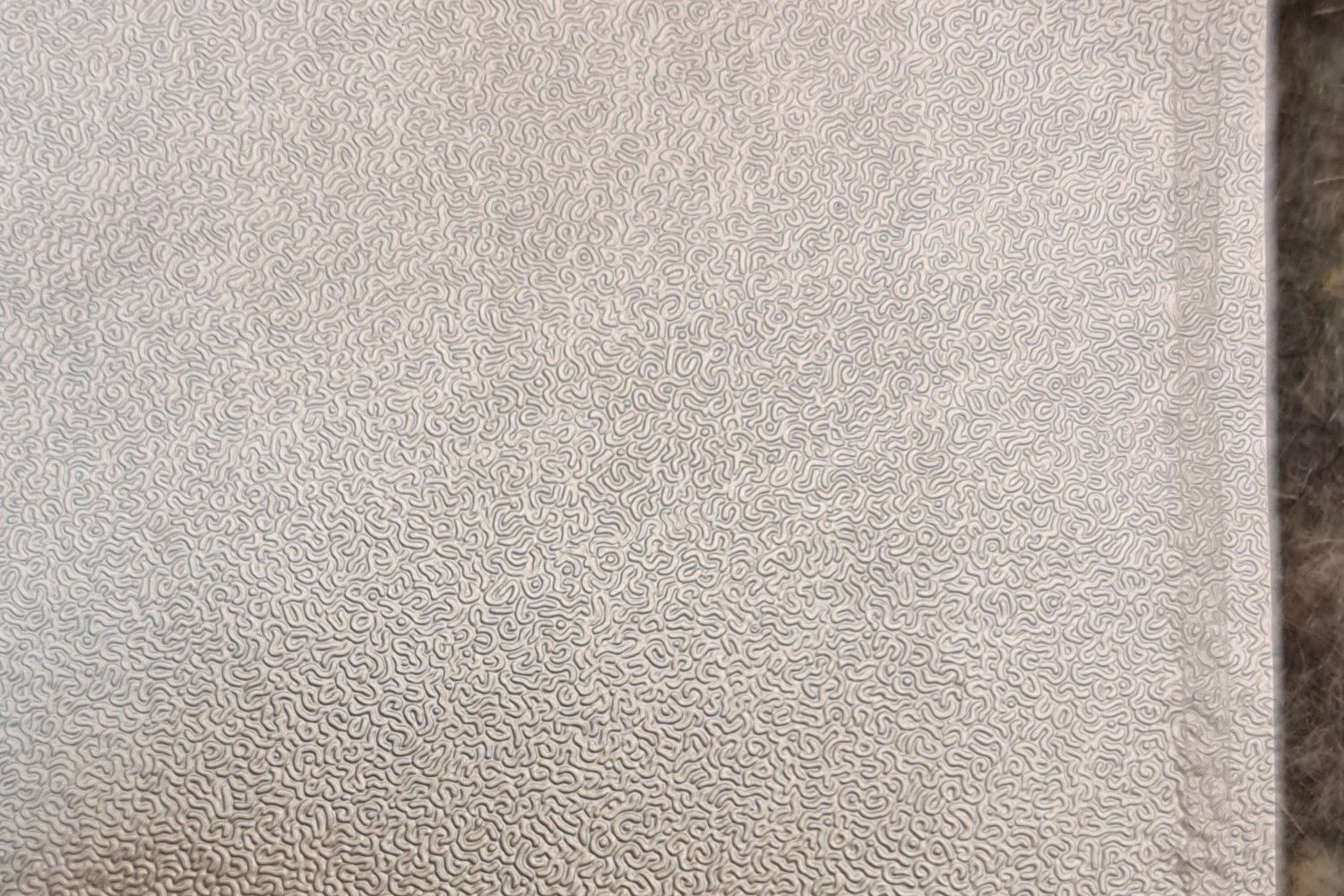 'This picture shows the lid (aluminium/aluminum foil) of a cup of margarine. The stripe on the side is where it was sealed to the plastic, about 3 mm wide. Some yogurt cups have similar foils. I have been intrigued by the pattern for years and have collected a large number (basically any that is not damaged and that I can get my hands on before my mum throws it away) because I thought that would help me understand the deeper meaning of the pattern, but it doesn't. It looks remotely like ripples caused by water or wind on sand. Do the manufacturers have a mold that produces the same pattern on every lid? I can't find any repetition or symmetry in this pattern. Is the pattern created new and different for every lid? If yes, by what process? What is the advantage of this pattern, other than the aesthetic look, over a flat foil as most lids have?'
