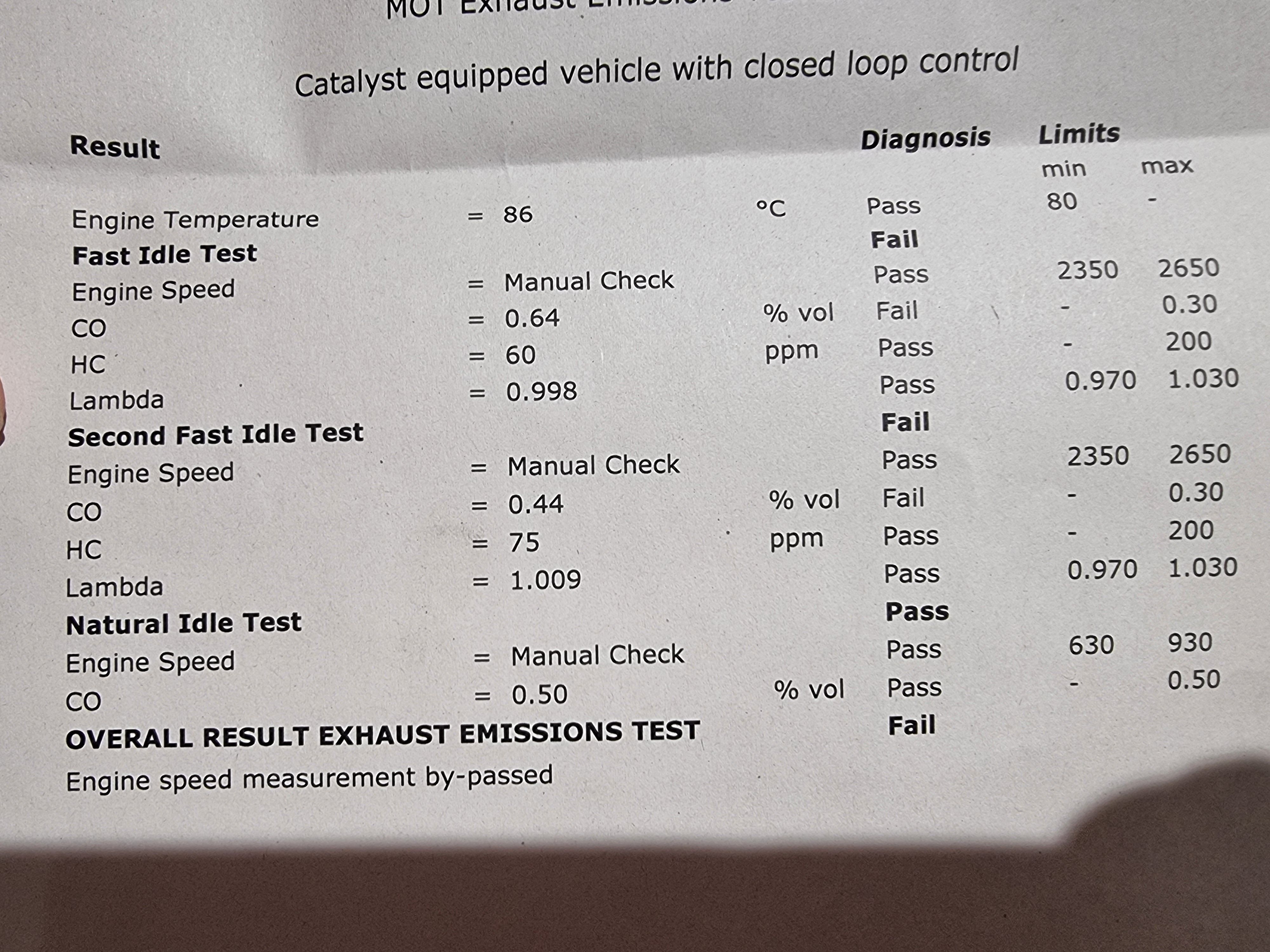 They only told me the CO, didn't get the print of all, but I'm sure lambda was close to 1. Have another test Wednesday, I'm going to clean the air filter as best I can, try and figure out how to make sure there's no leaks around the air intake side, and consider whether I use my vag diag software (I have odis-e) and flash my stage 1 remap back to factory to get it through mot. I wouldn't be able to flash it back to remapped though so I'd lose my remap.