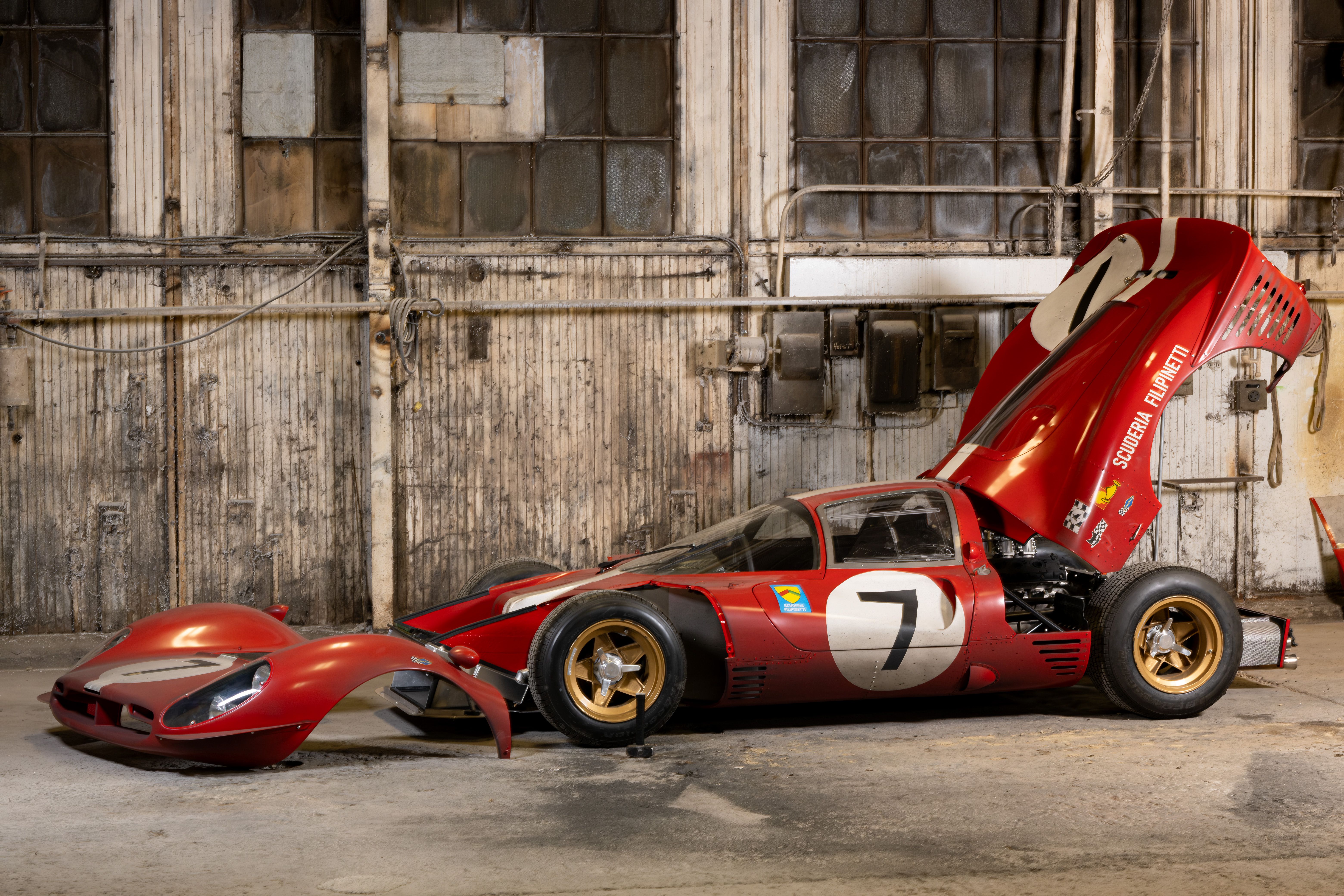 She has a custom tube frame, entirely carbon fiber bodywork, a Ferrari V12 (from a 456), with Jenvey ITB's and a ZFQ transaxle. The wheels are original Campagnolo's once worn and used in anger by #0844.