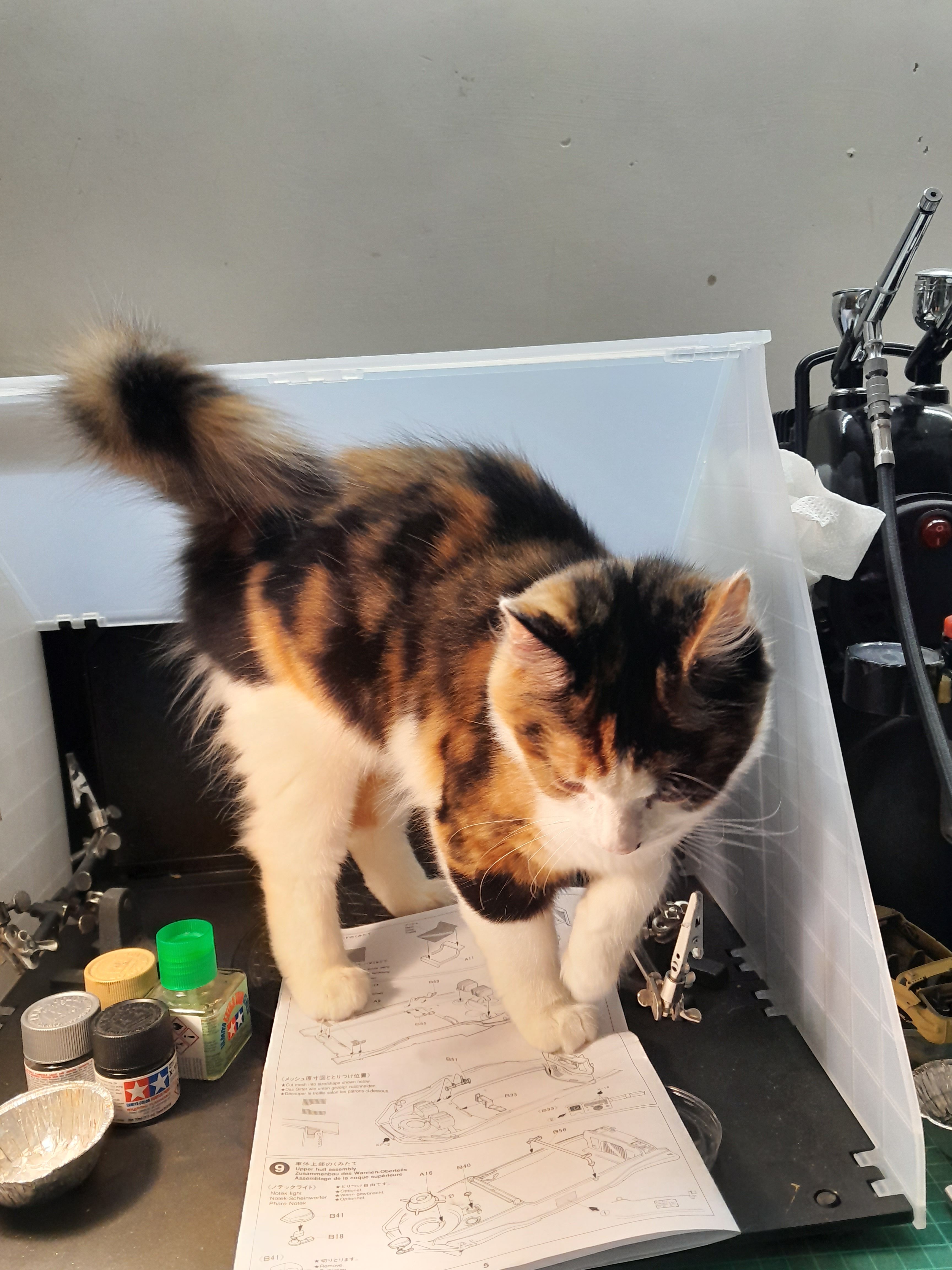 Today my furry assistant (Daisy the destroyer) decided to jump up and 'help' me with the construction of my Tamiya Schwimmwagen.