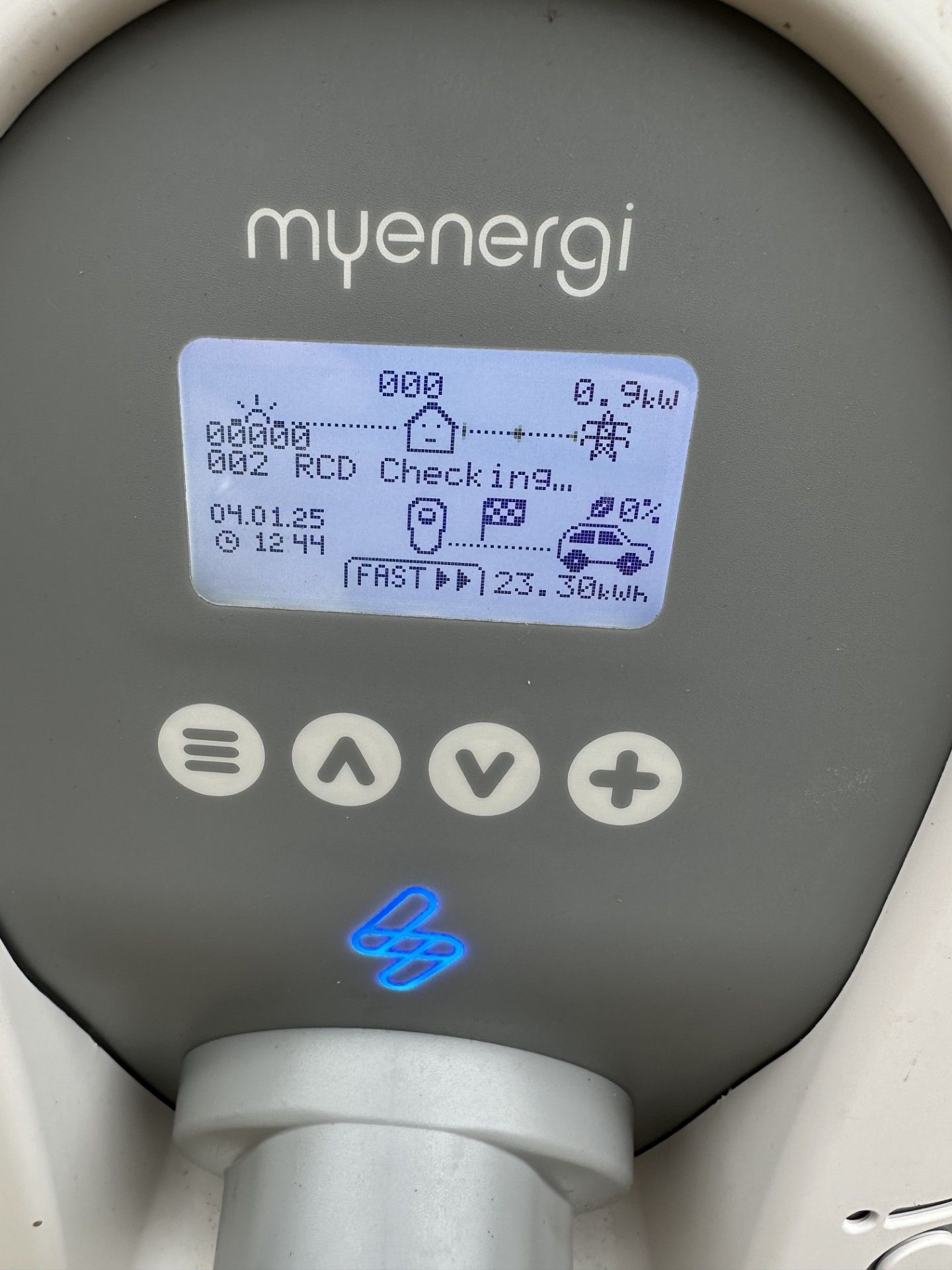 Over the last few days I realised, from the BMW app, that it was charging at only 6A and when I started to investigate I saw that the myenergi app was saying that my "device(s)" are disconnected. When the car is plugged in and charging (at 6A) the zappi home screen says "RCD checking"- I don't know how to interpret that (note there is another fault code for the internal RCD having triggered). I tried the reset RCD method anyway (holding down the menu button for 3 seconds)- no joy.