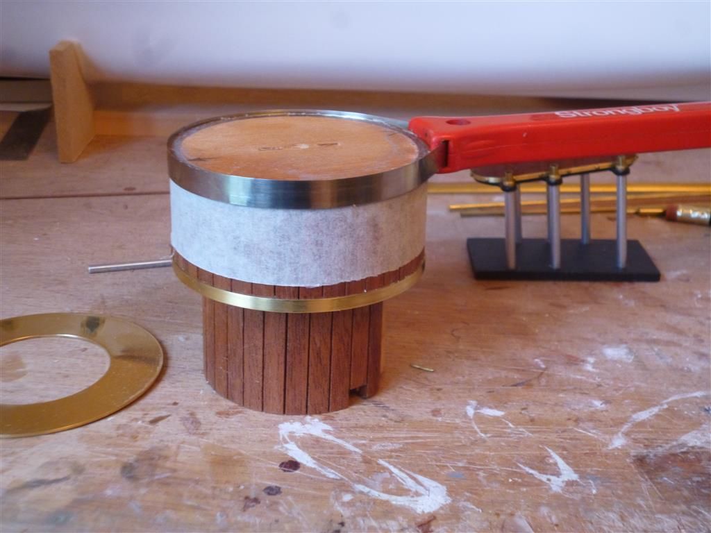 Now the boiler and engine. The boiler is nice and easy to do - a chunk of wood tuned to size and planked with mahogany. It still took me three goes to get the diameter exactly right!